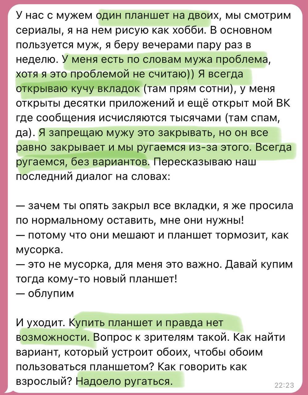 В комментариях к истории в канале читатели предложили кучу вариантов. Некоторые даже пришли к выводу, что дело не в планшете и пора разводиться. Я такой вывод сделать не могу, так как вижу в истории автора только одну поломанную коммуникацию, а не историю отношений в целом.