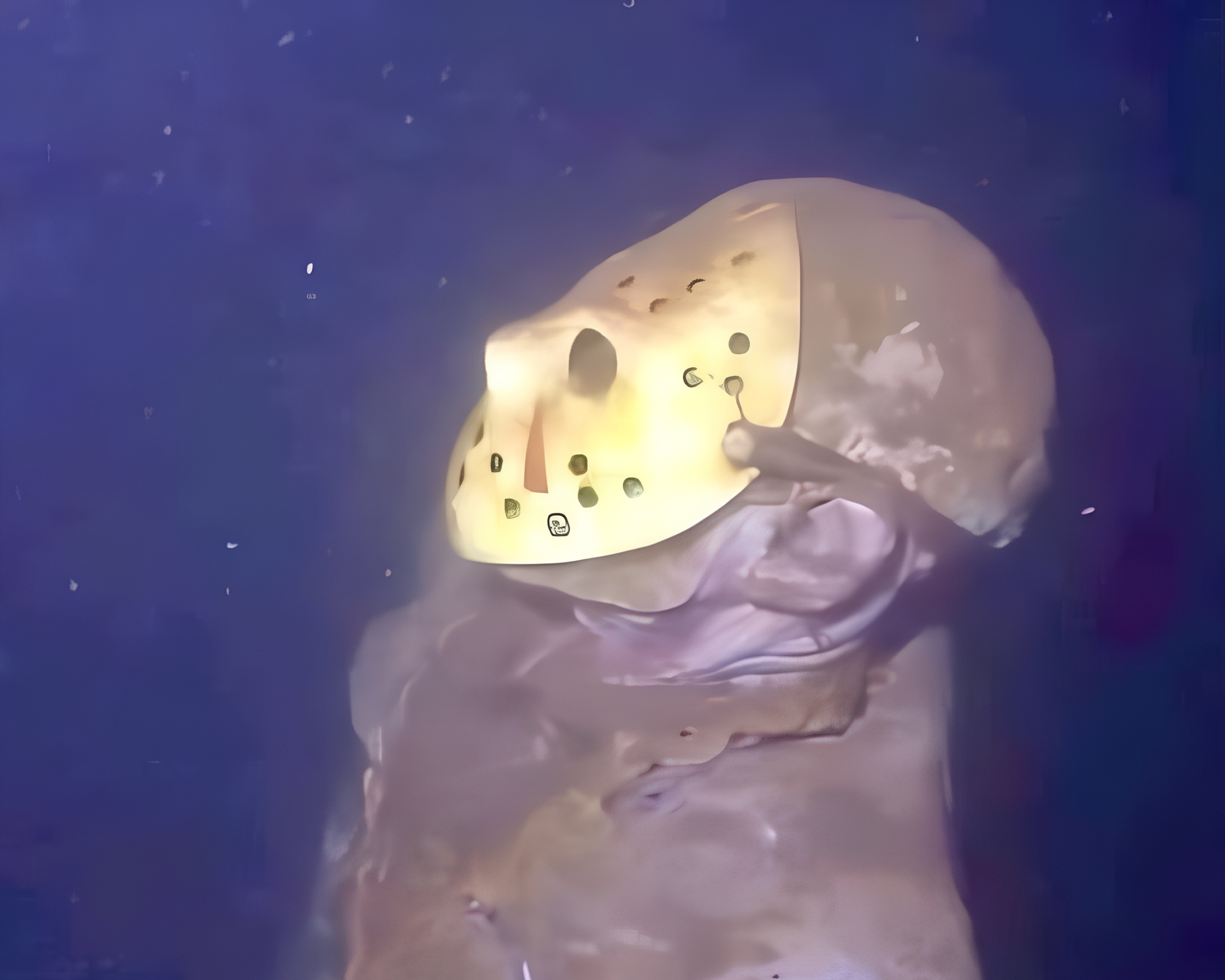 Статуя с хоккейной маской, мачете и цепями скрывается в темноте, превращая погружение для дайверов в неожиданно жуткий опыт.
