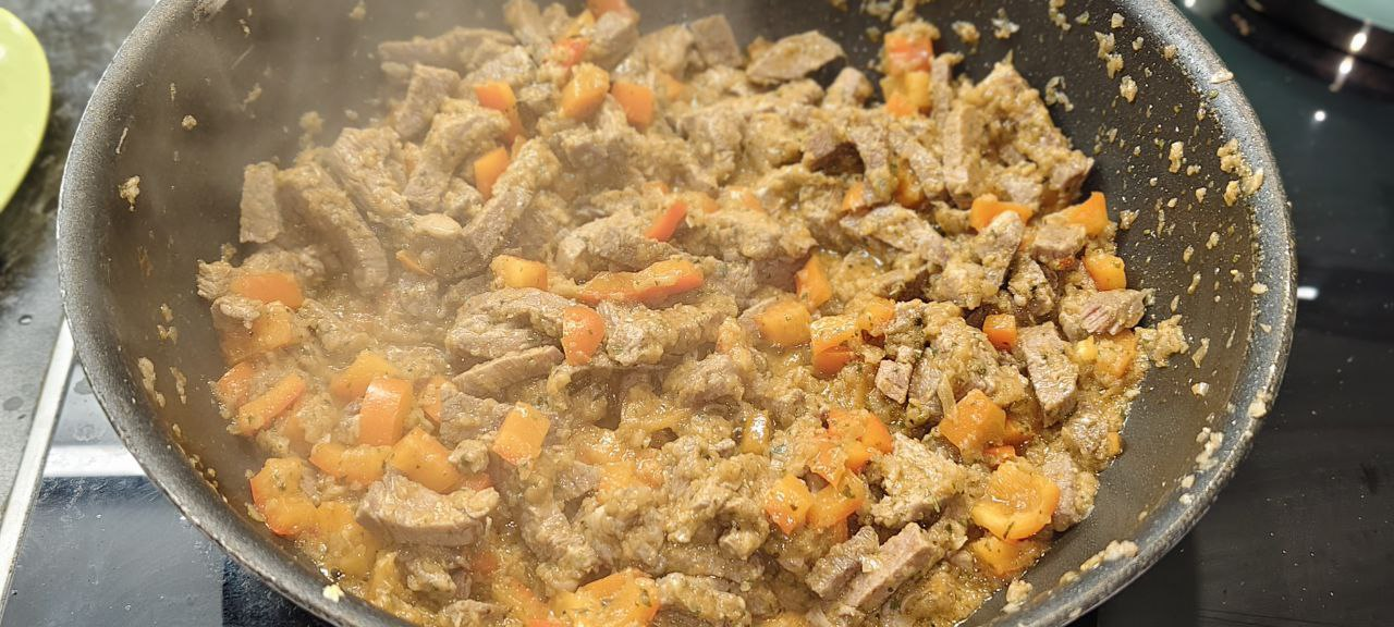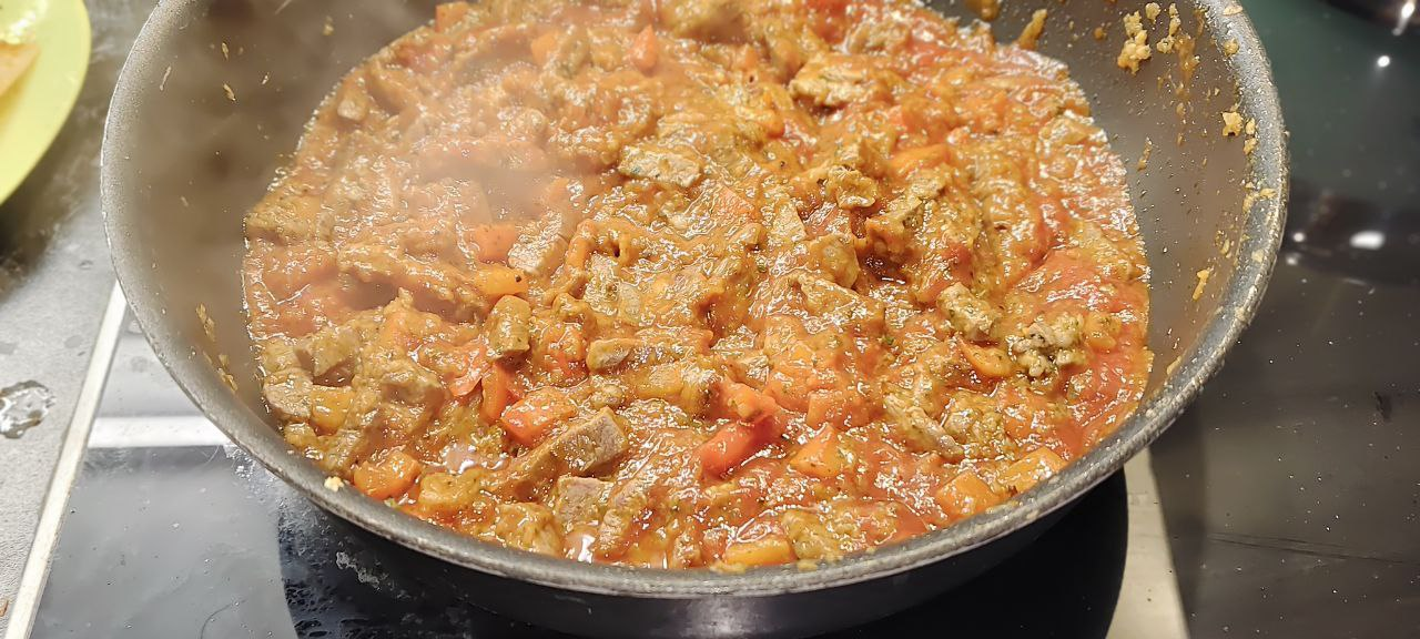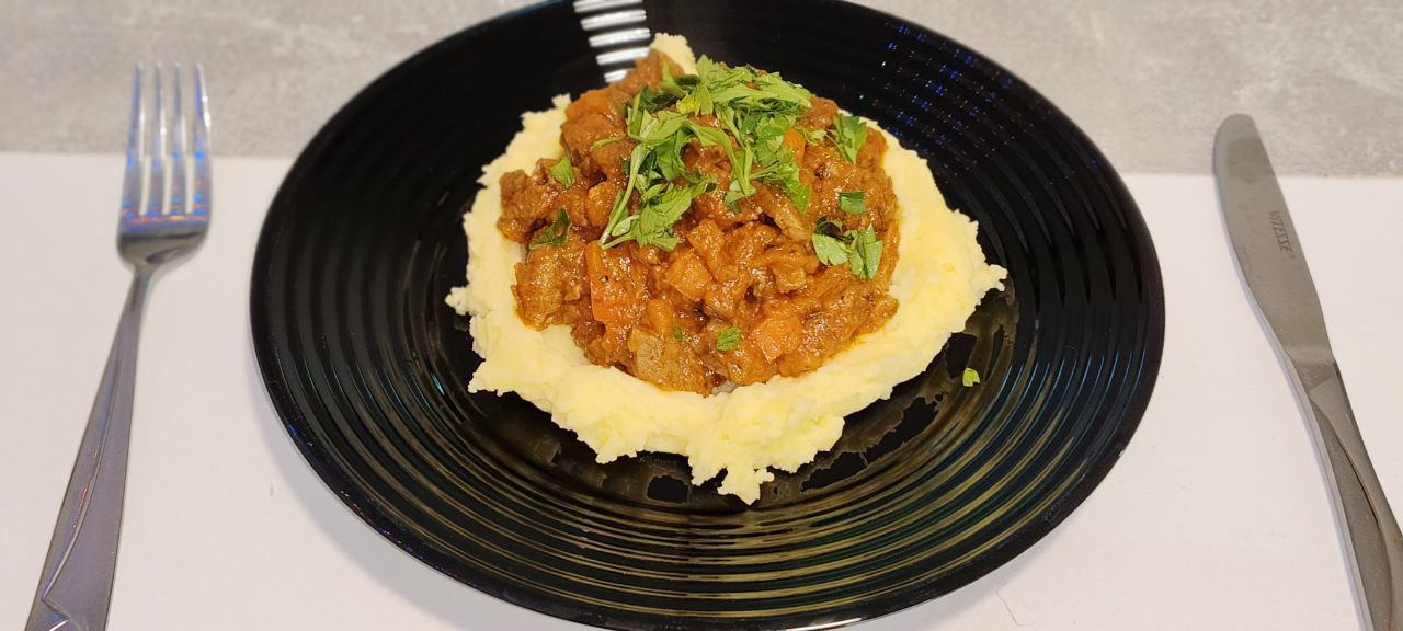 Сегодня на ужин гуляш из говядины в томатном соусе с картофельным пюре.