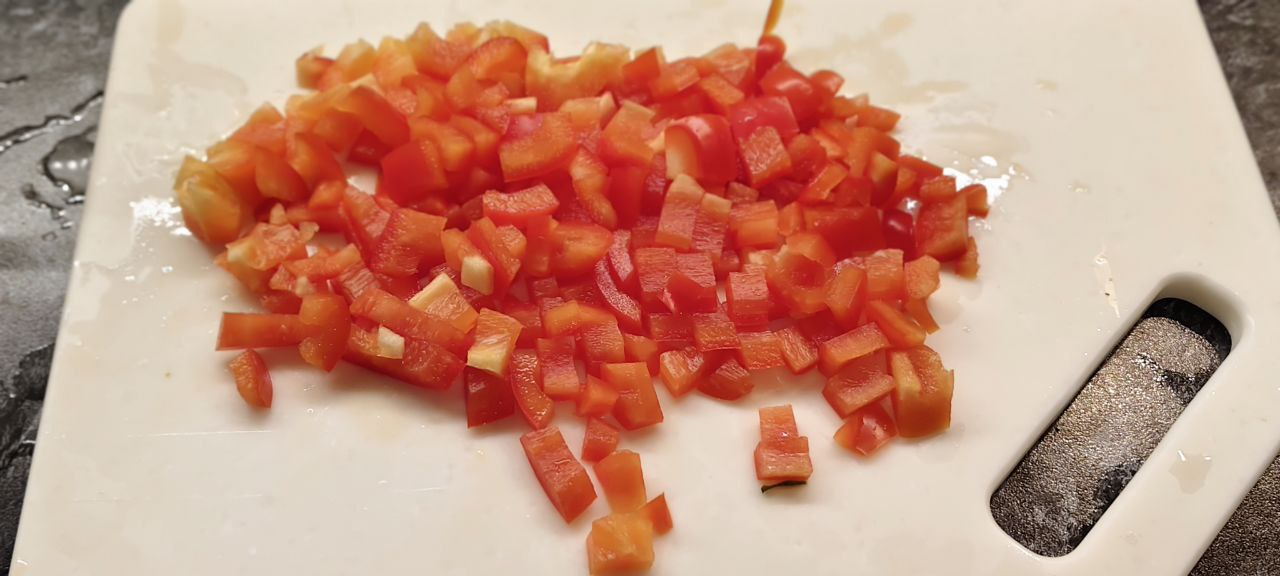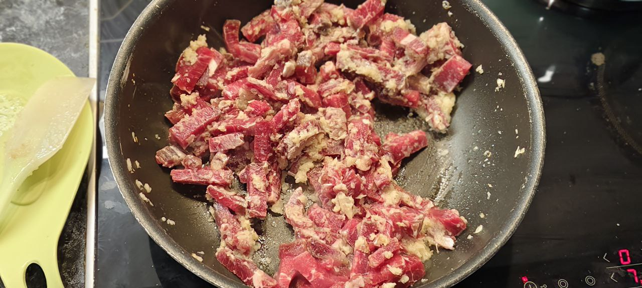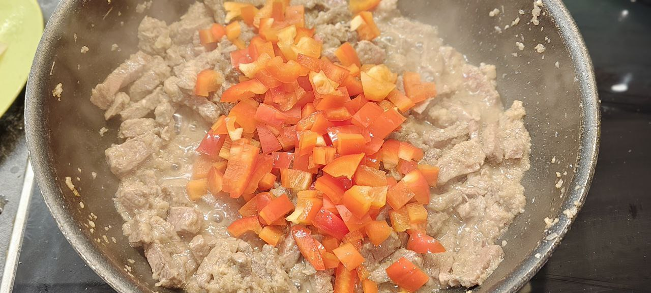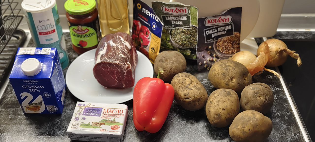 Говядина, картофель, лук, болгарский перец, сливочное и растительное масло, болгарский перец, томатный соус "Буздякский" с базиликом, сливки, соль и специи