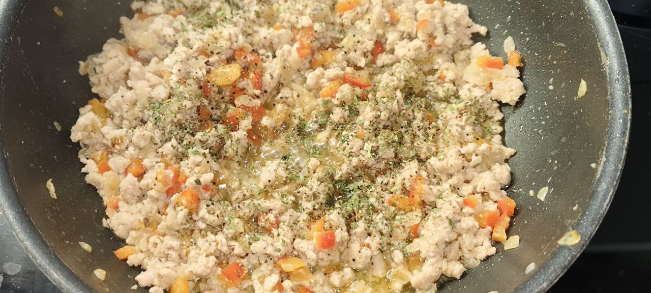 Картофель, фарш ( домашний), сыр, болгарский перец, масло, сливки, лук, зелень, томатный соус, приправы, соль и перец.