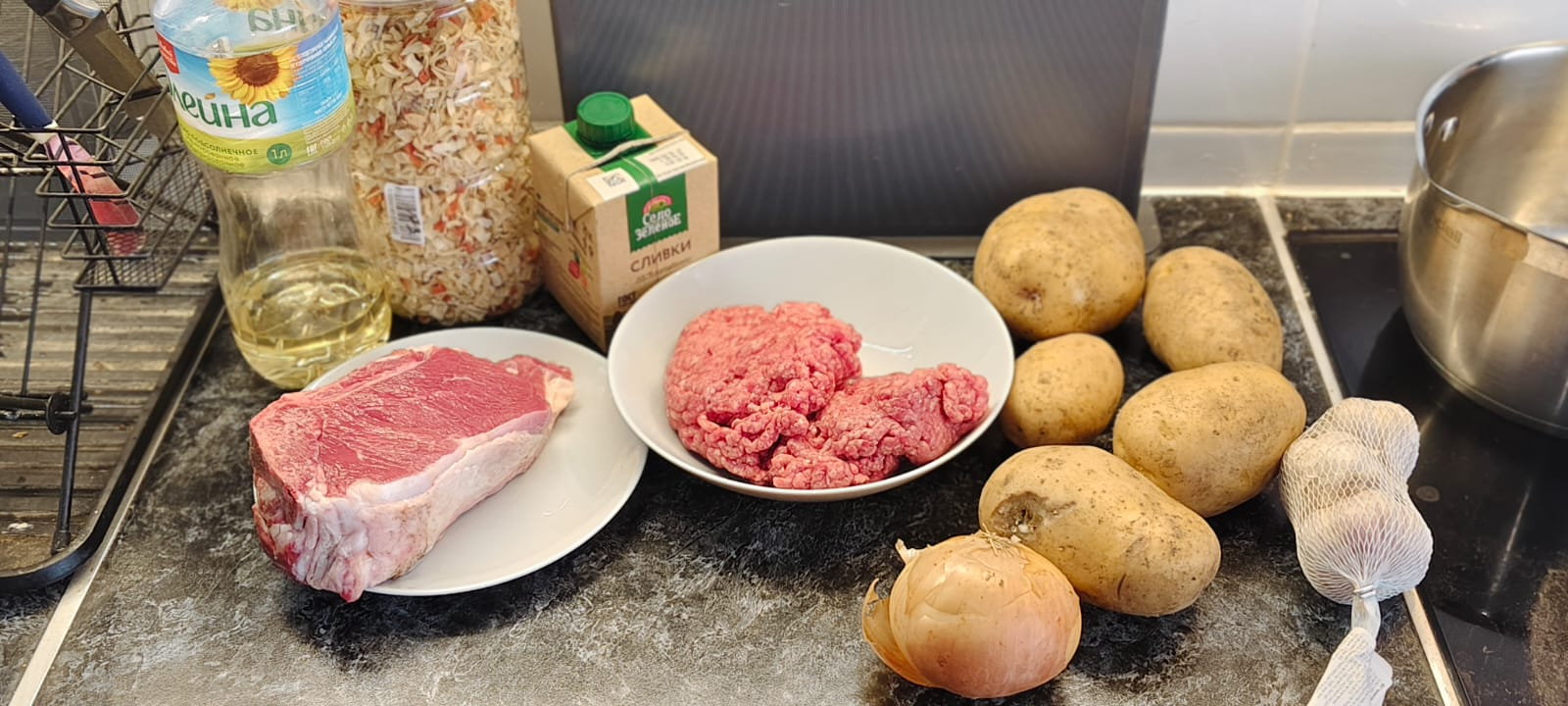 Картофель, говядина на кости, говяжий фарш, сливки 10%, лук, чеснок, масло, коренья. Соль и перец в кадр не вошли :)