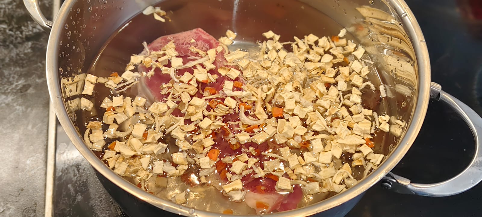 Для супа нужен бульон. Готовый у меня закончился, бульонные кубики использовать не хочу. Поэтому делаю бульон на свежем мясе на косточке. В суп мясо не пойдет. Но вареная говядина всегда пригодится! Варю с кореньями и солью.