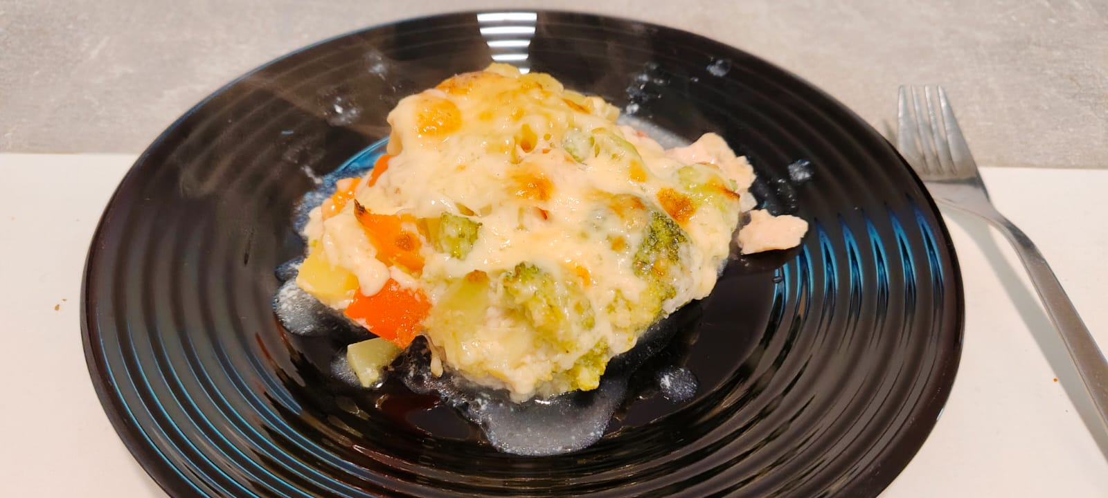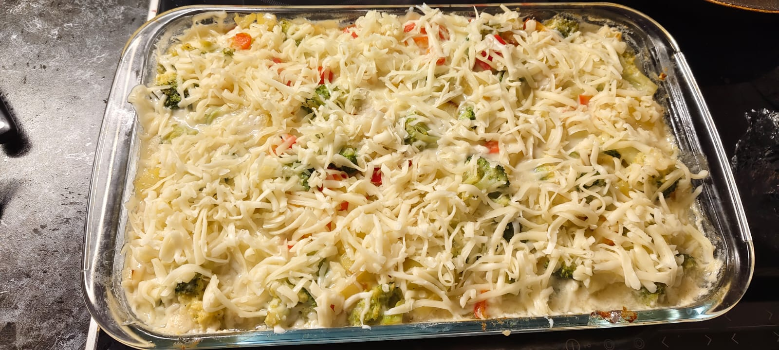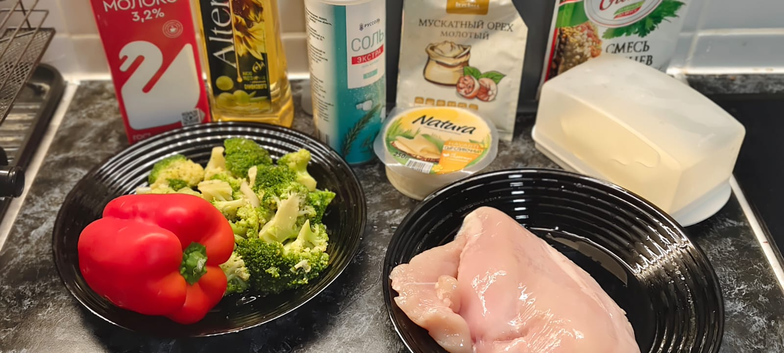 Курина грудка, брокколи, болгарский перец, сыр, соль, перец, мука, молоко, масло растительное и сливочное, мускатный орех