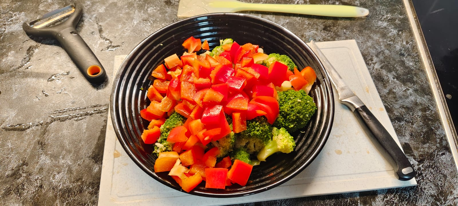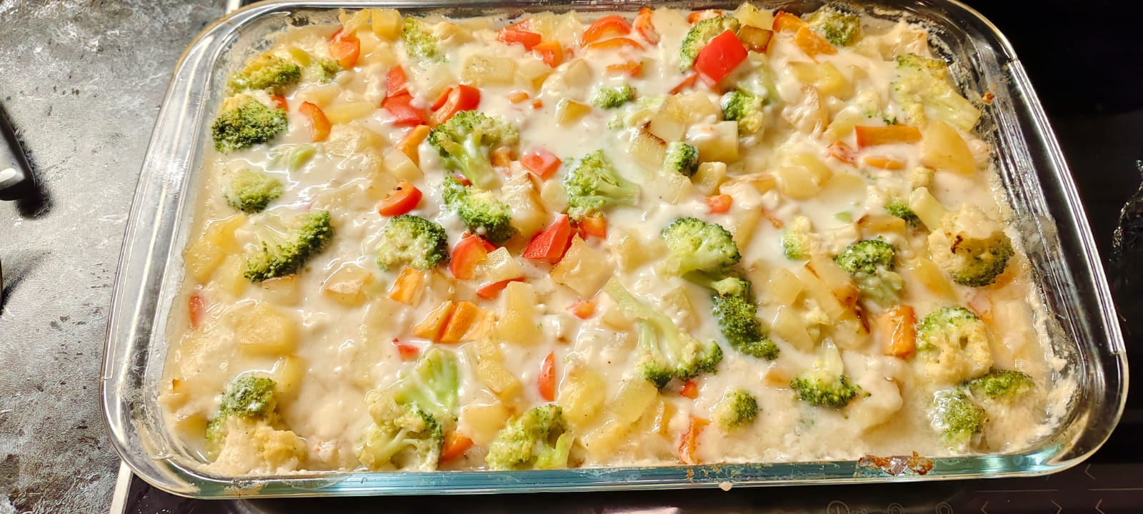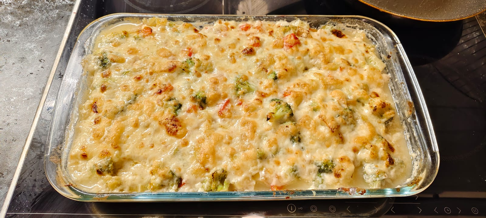 Курина грудка, брокколи, болгарский перец, сыр, соль, перец, мука, молоко, масло растительное и сливочное, мускатный орех