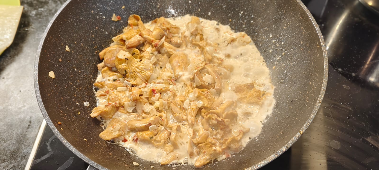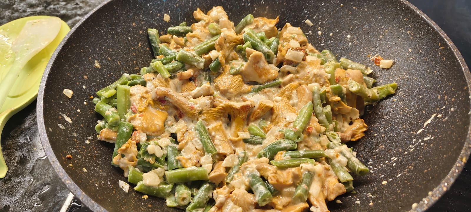 Лисички, фасоль стручковая, мука, сливки, лук, мускатный орех, смесь базилика и томатов ( приправа в банке), соль перец. Забыл поставить подсолнечное масло.