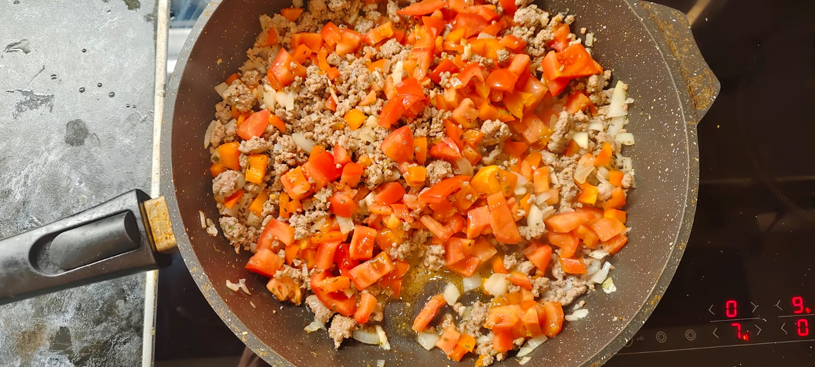 Макароны (перья), фарш домашний (свинина+говядина), лук, томаты, перец сладкий, кавказские травы, сливочное и растительное масло, соль, перец.