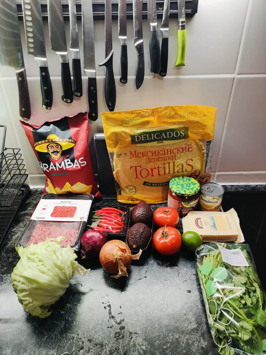 Говяжий фарш, красный лук, белый лук, авокадо, томаты, фасоль, кукуруза, лайм, сыр, салатный листья, острый перец, кинза, чеснок, чипсы начос и тортильи.