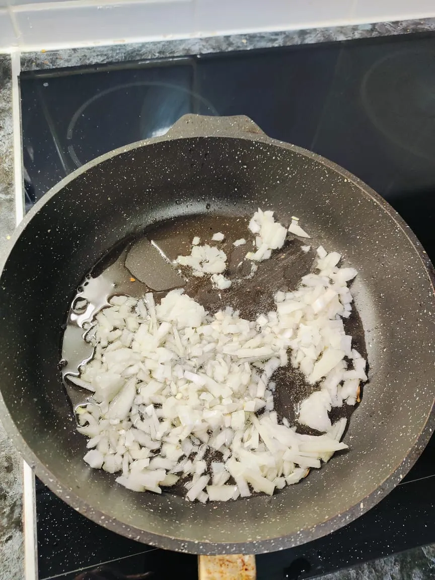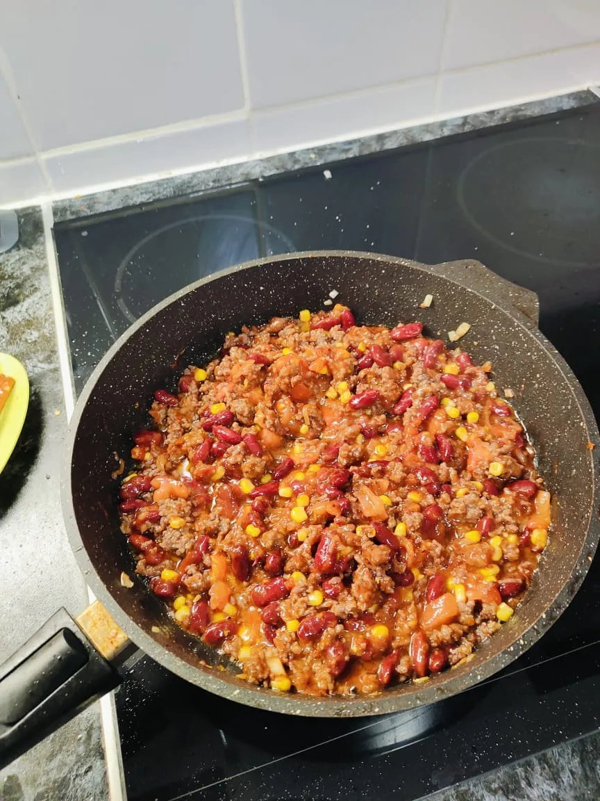 Добавляю фарш, обжариваю до готовности ( не сфоткал). Потом добавляю фасоль, кукурузу, очищенный и порубленный помидор. Солю перчу, добавляю специи и тушу несколько минут.