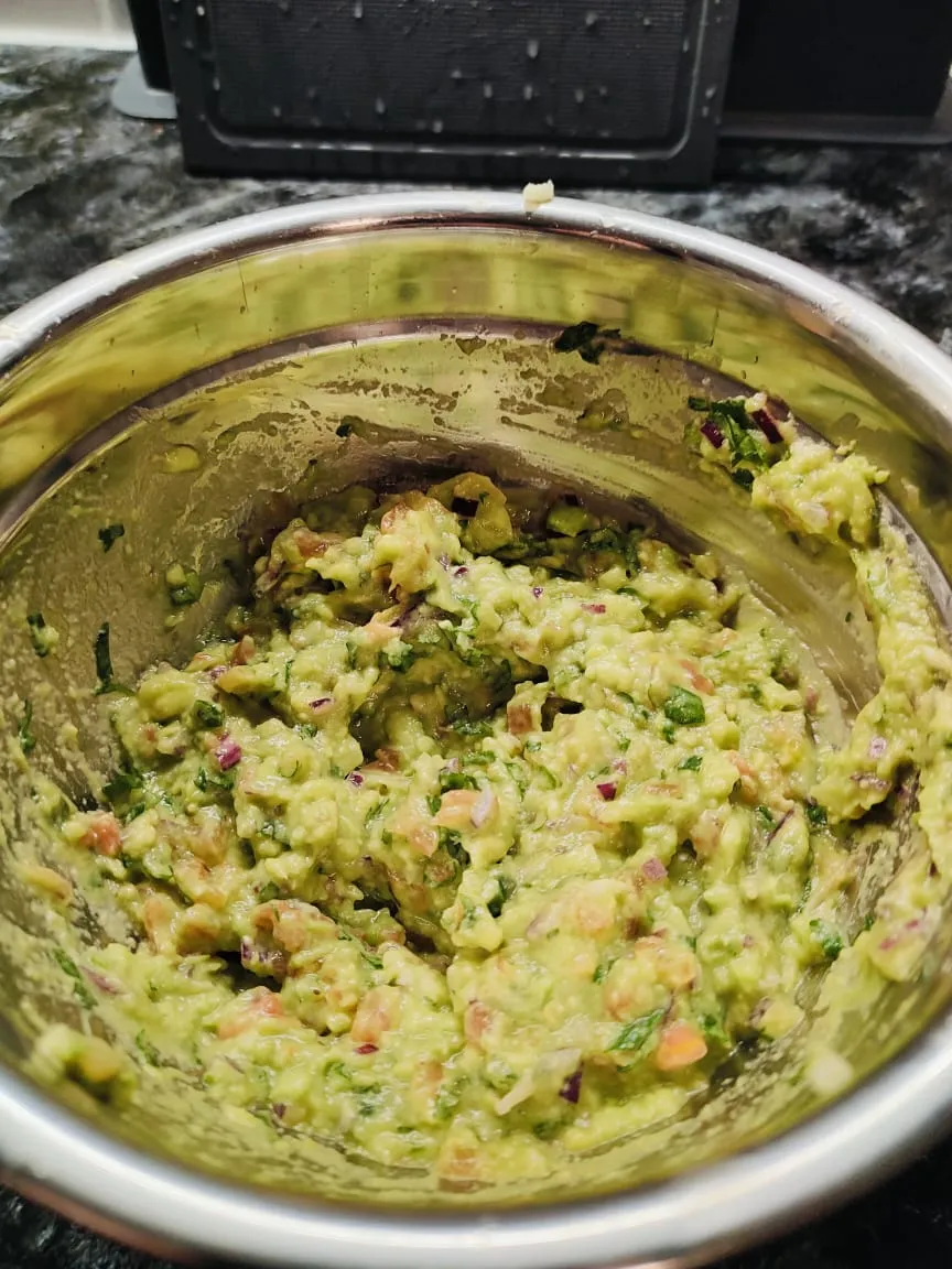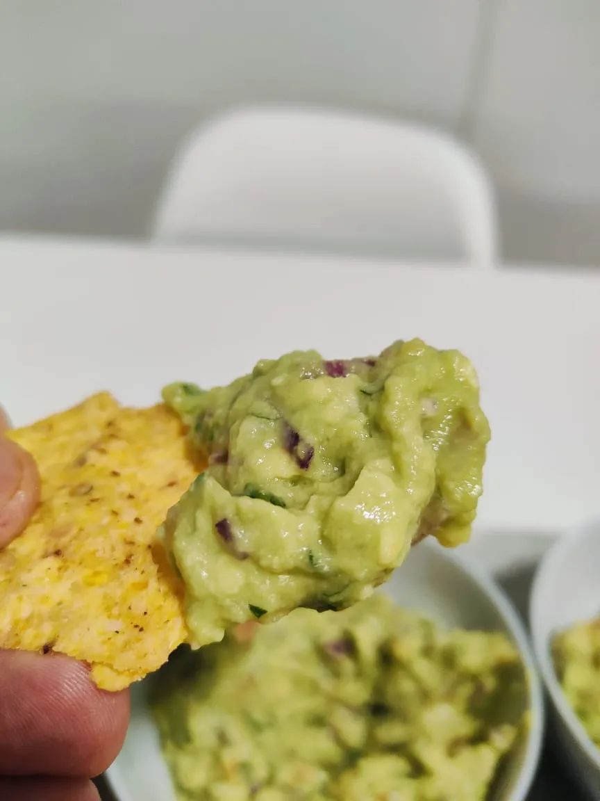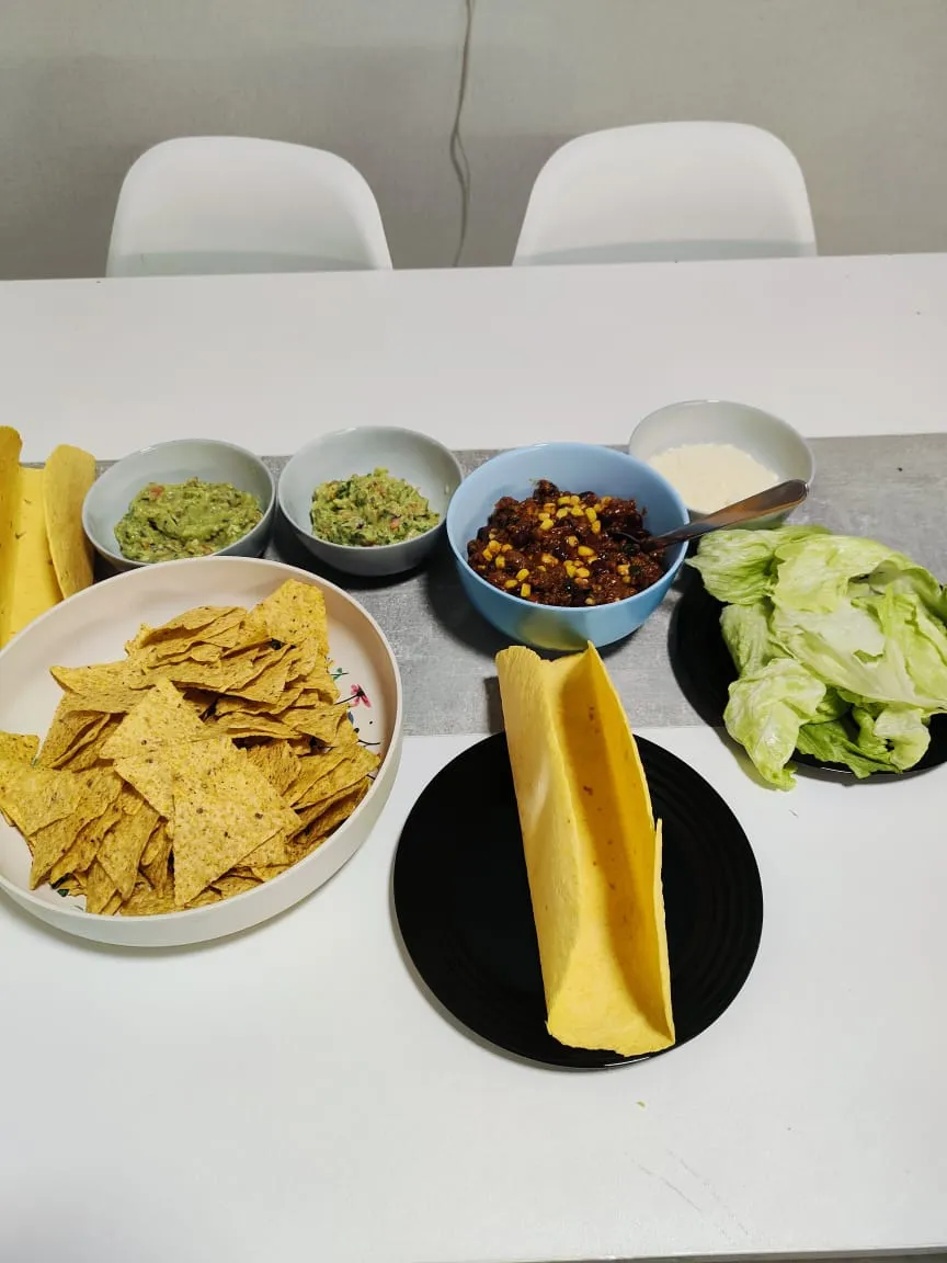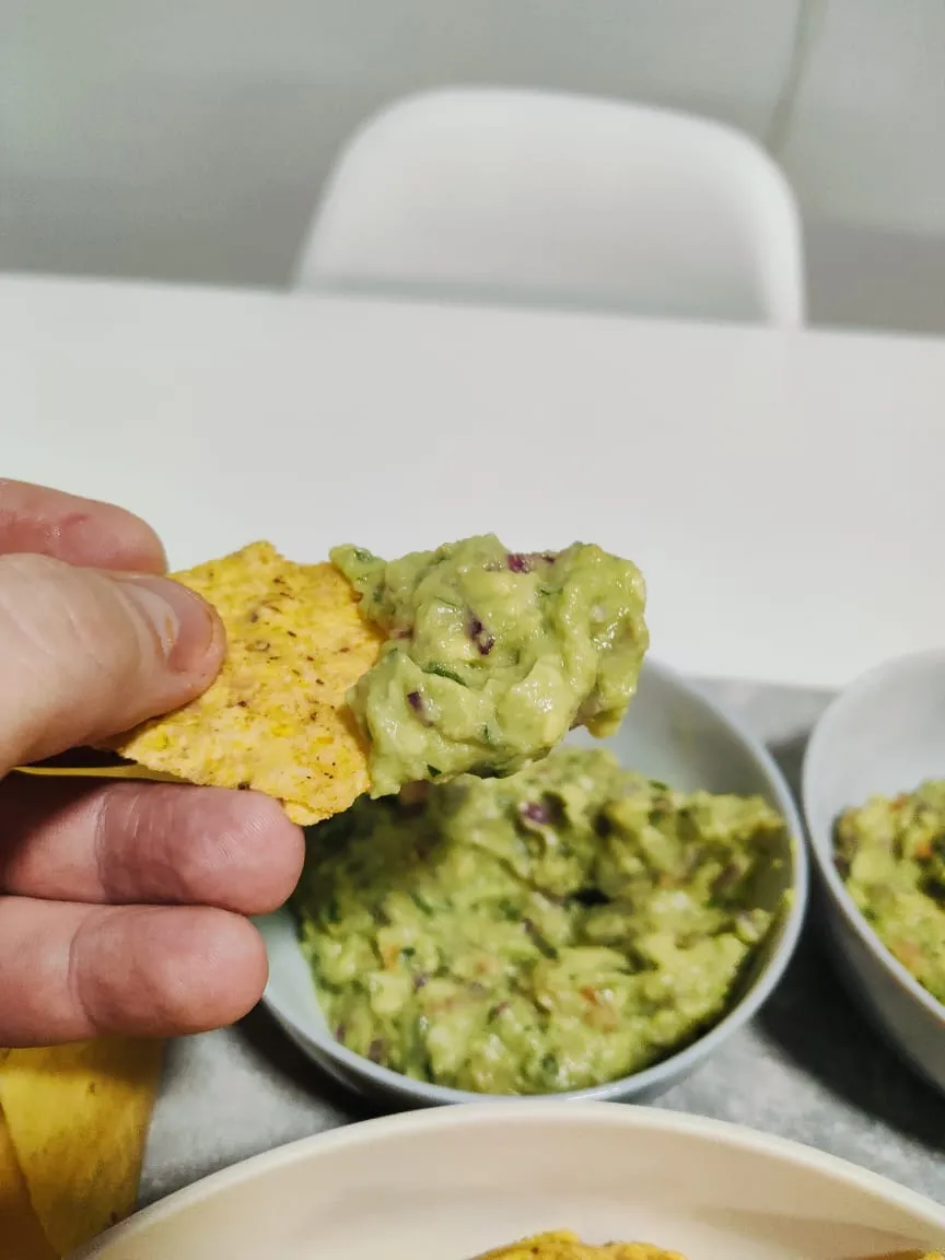 Высыпаю чипсы начос в миску, раскладываю гуакамоле и наполнитель для лепёшек Тако. Каждый собирает сам свой Тако!