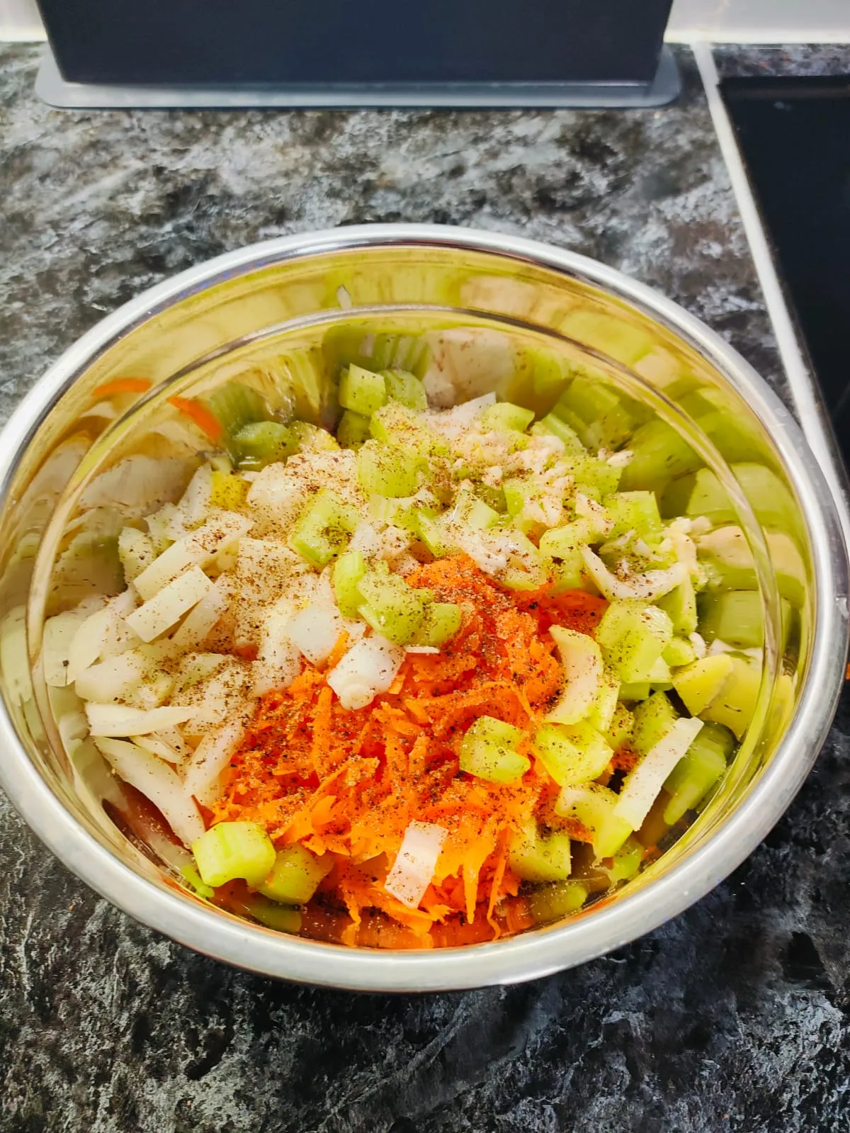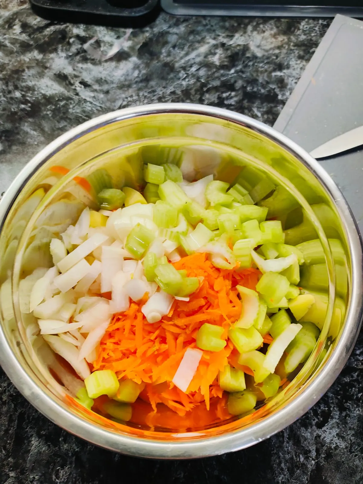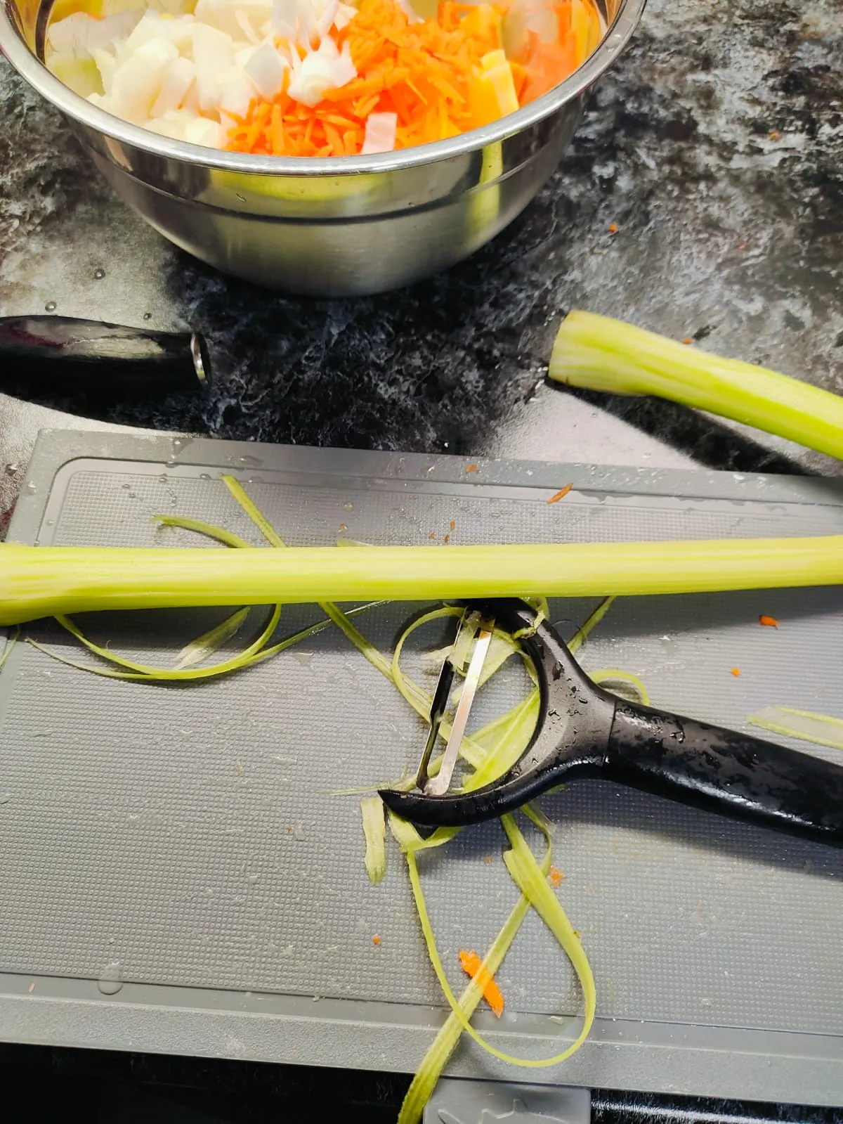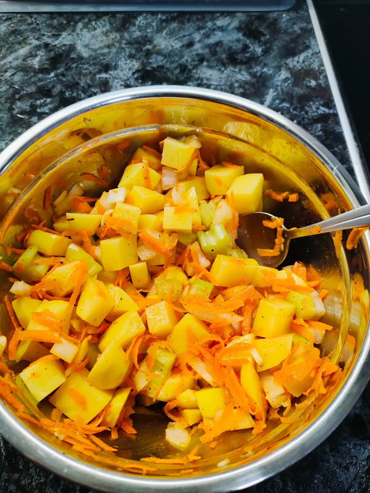 Бахаю, сельдерей, натертую морковь и порезанный лук к картошке.