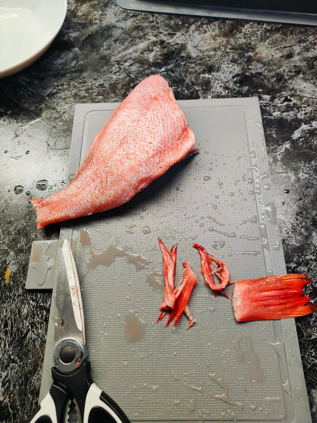 Пока занимался овощами рыба разморозилась. Отрезаю хвост и плавники кухонными ножницами.