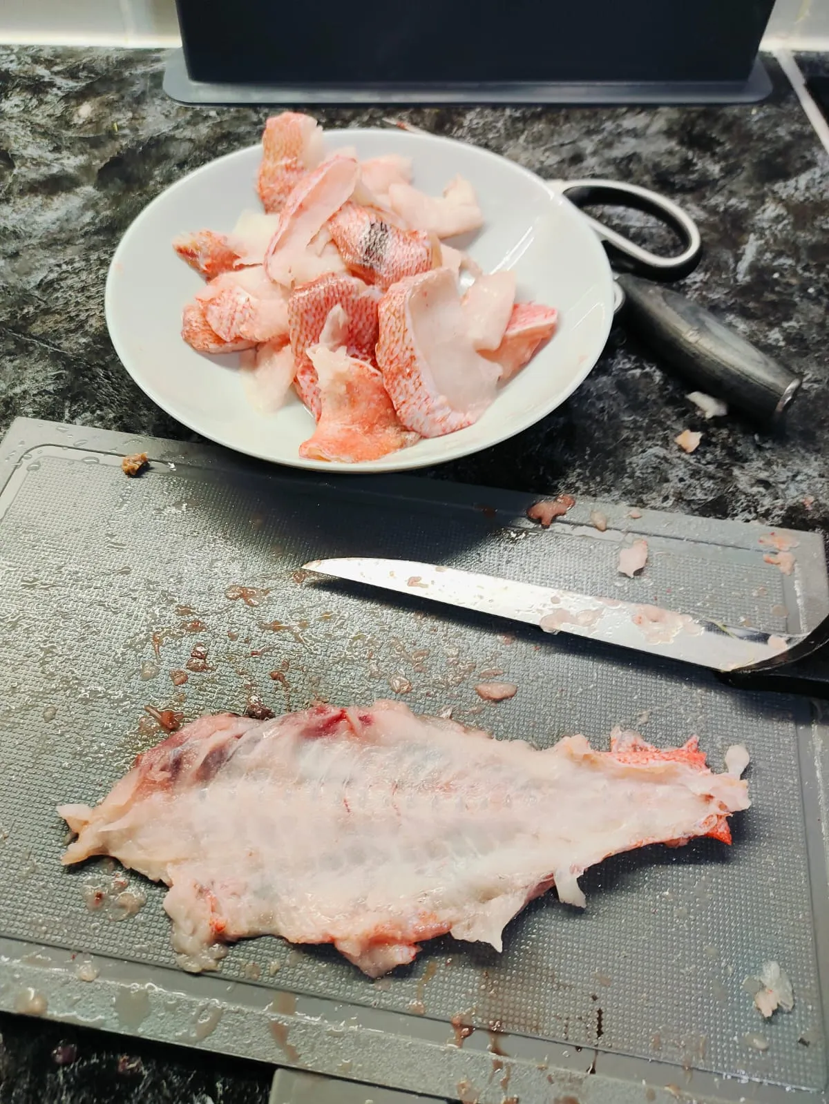 Отделяю рыбный филей от костей. Косточки пойдут в морозилку на рыбный бульон.