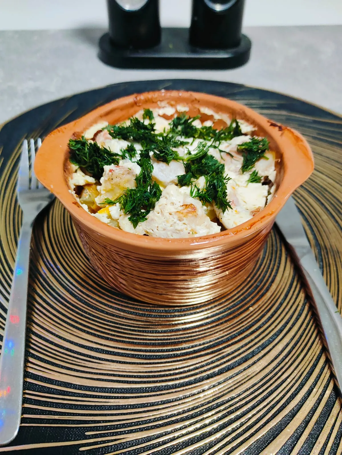 Морской окунь (Очищенный без головы), картошка, морковка, сельдерей, лук, чеснок, зелень, сметана, специи ну и горшочки!