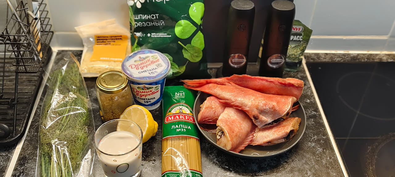Морской окунь (тушки без головы), спагетти, сметана, сливки, сыр тёртый, сметана, укроп, лимон. Лимонграсс. Соль, перец. На фото ещё есть зернистая горчица, но я передумал её использовать. А вот чеснок забыл положить :(