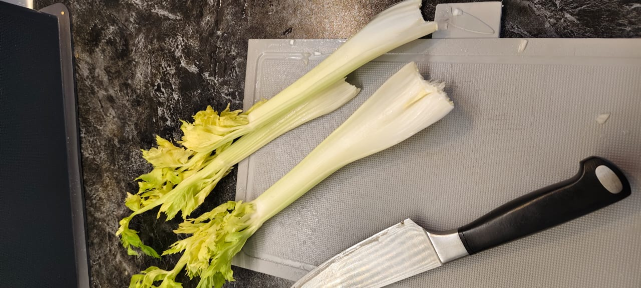Смешиваю на сковороде нарезанный лук и сельдерей. Смешиваю растительное и сливочное масло. Поджариваю.