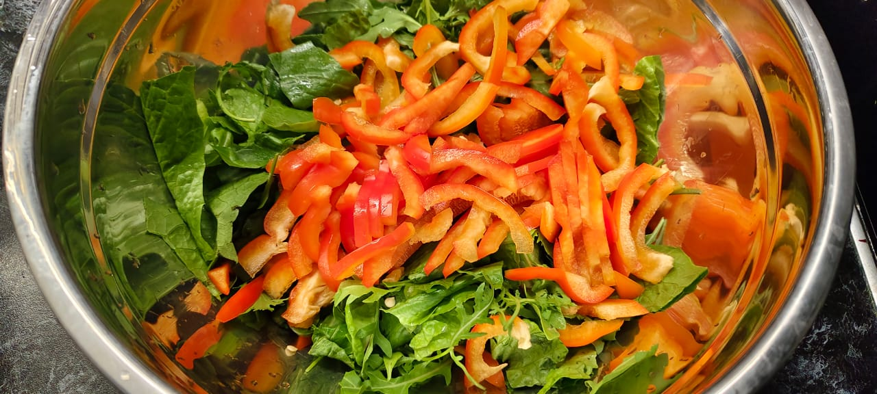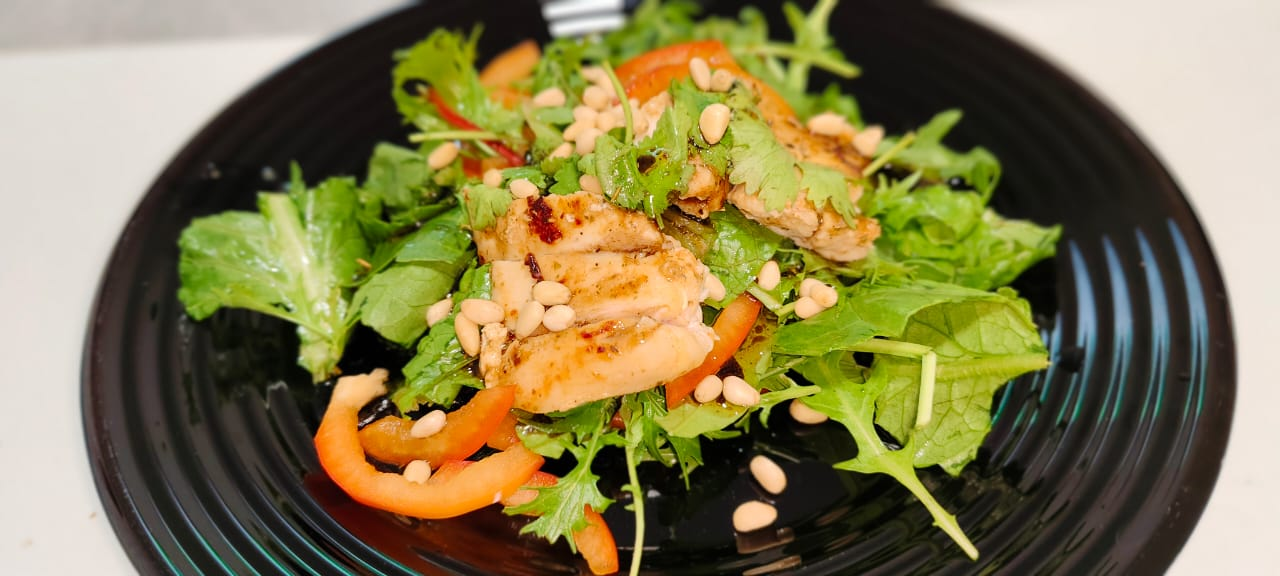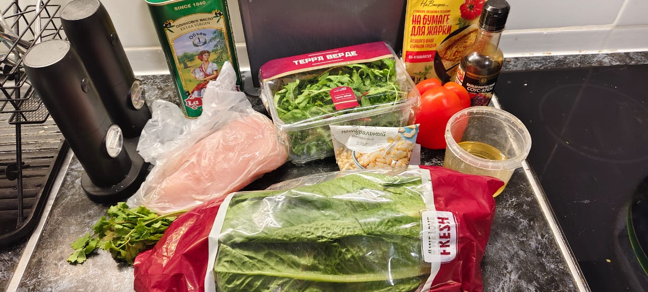 Салат "Романо", рукола, кинза, курица, болгарский перец. Для заправки оливковое масло, соль, перец, бальзамический соус, мед, кедровые орехи. Специальная бумага для жарки курицы.