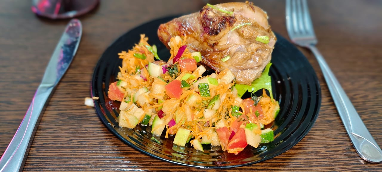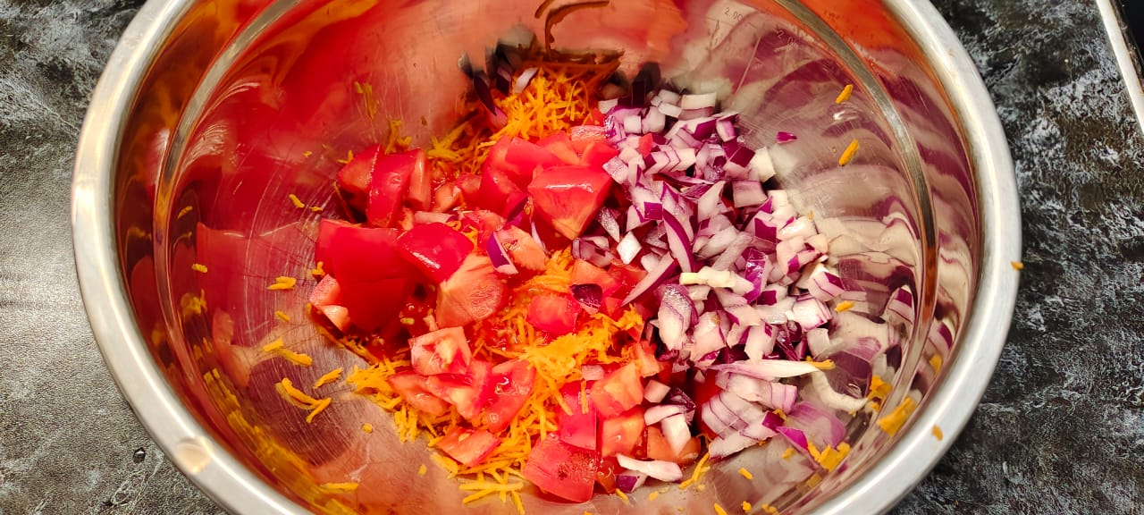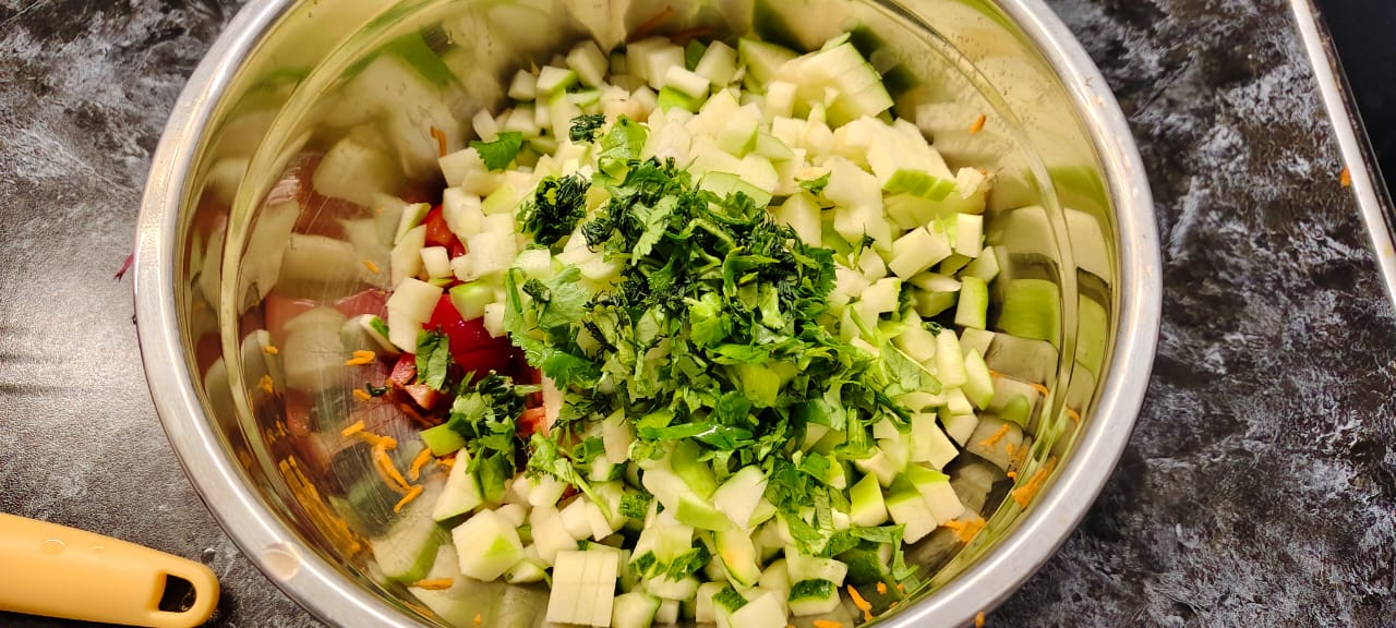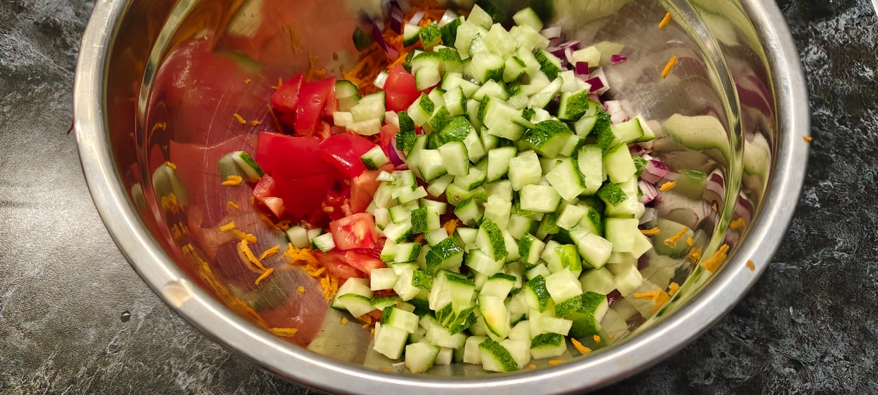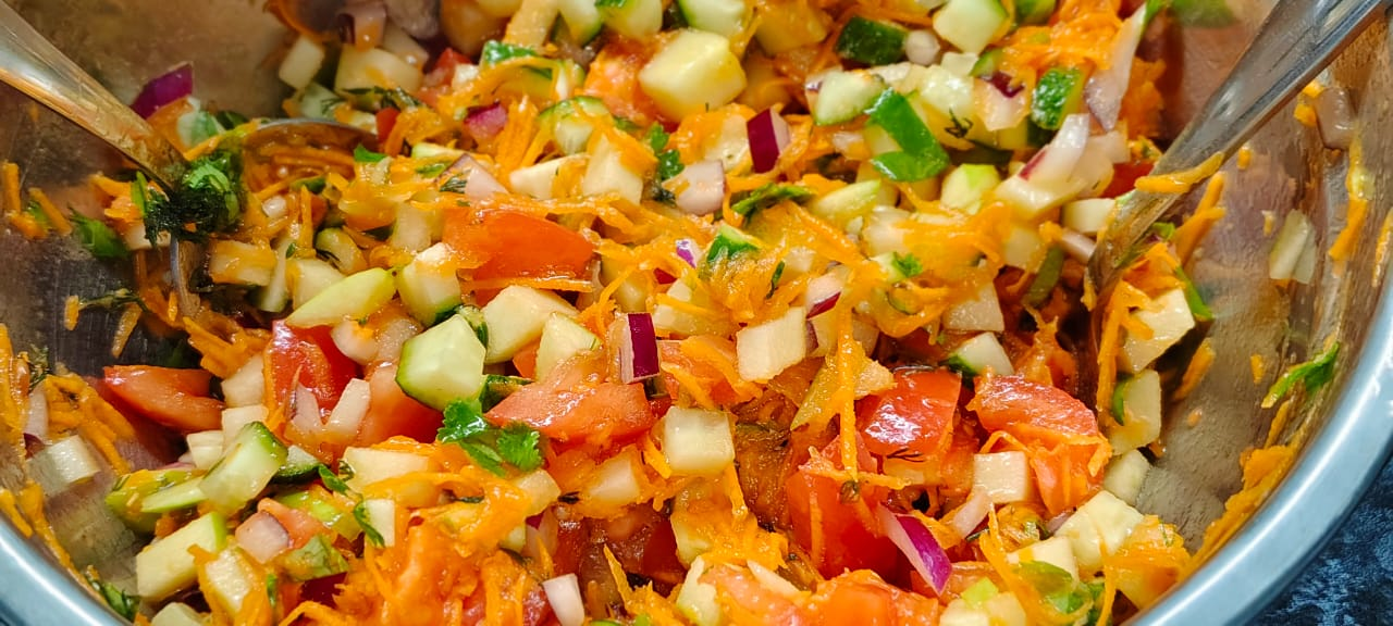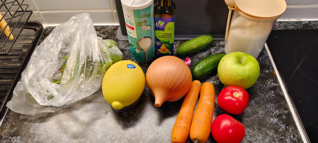 Лук (красный), морковь, томаты, яблоко ( кислое), огурцы, лимон, салатная заправка, зелень ( укроп и петрушка), соль, сахар.