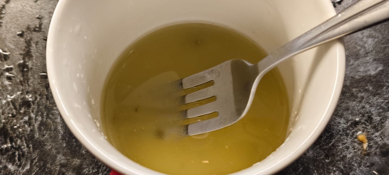 В салатную заправку добавляю лимонный сок, соль и сахар. Перемешиваю до однородности. Вместо заправки можно использовать просто масло, желательно оливковое