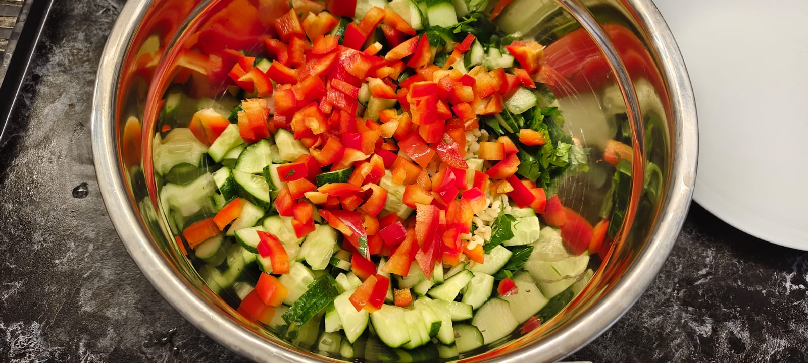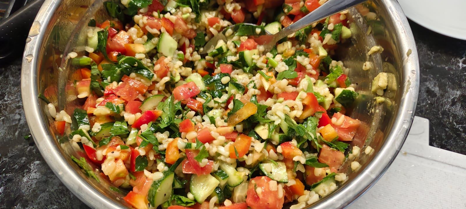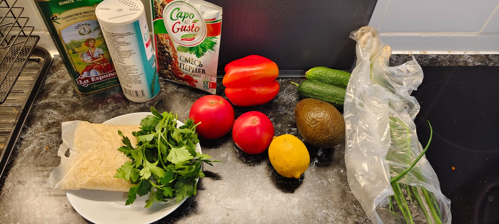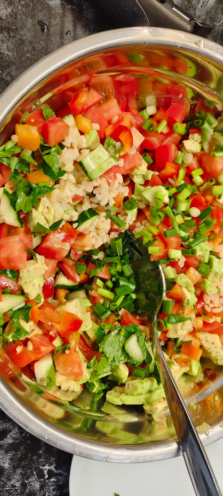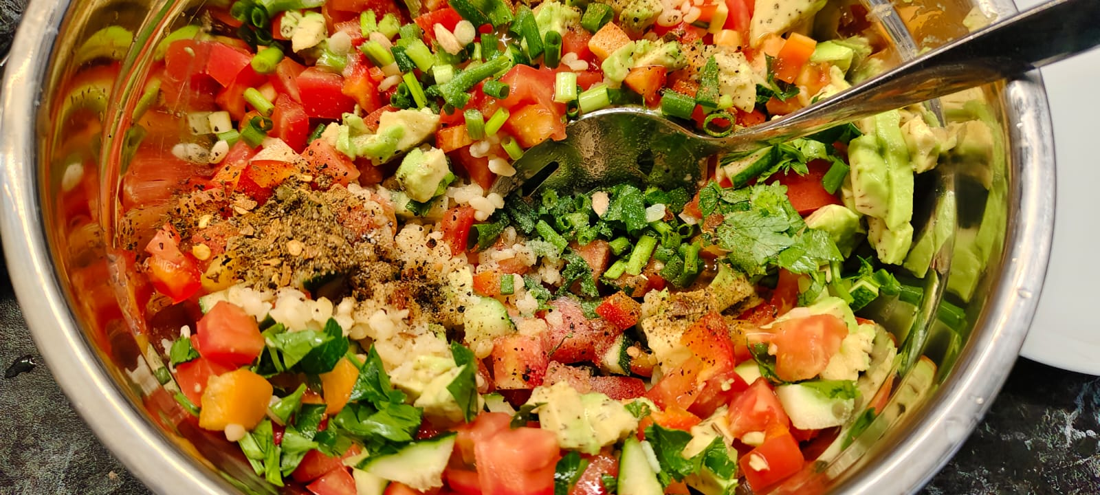 Отваренный булгур, томаты, болгарский перец, авокадо, огурец, лимон, кинза, зеленый лук, перец (смесь), соль, оливковое масло.