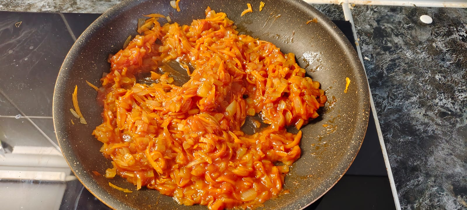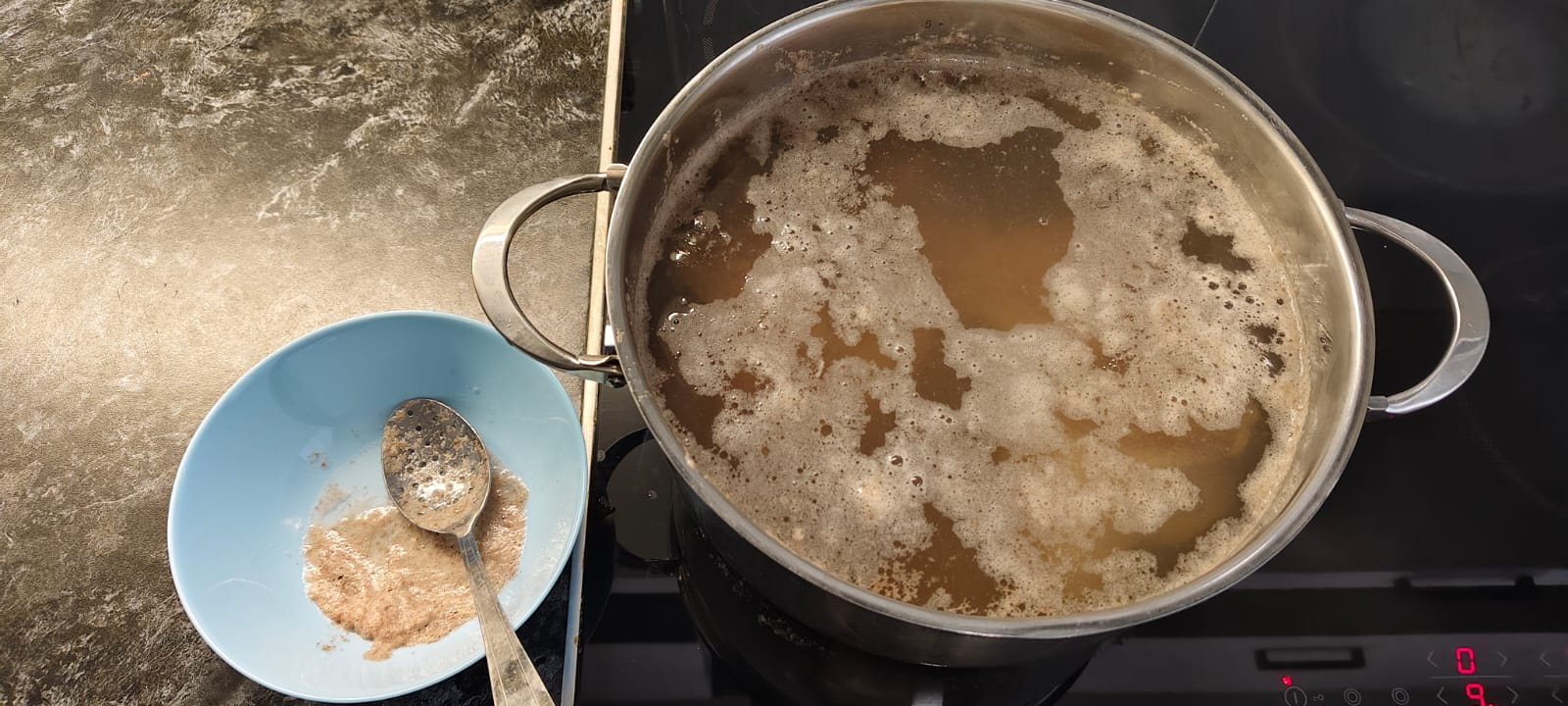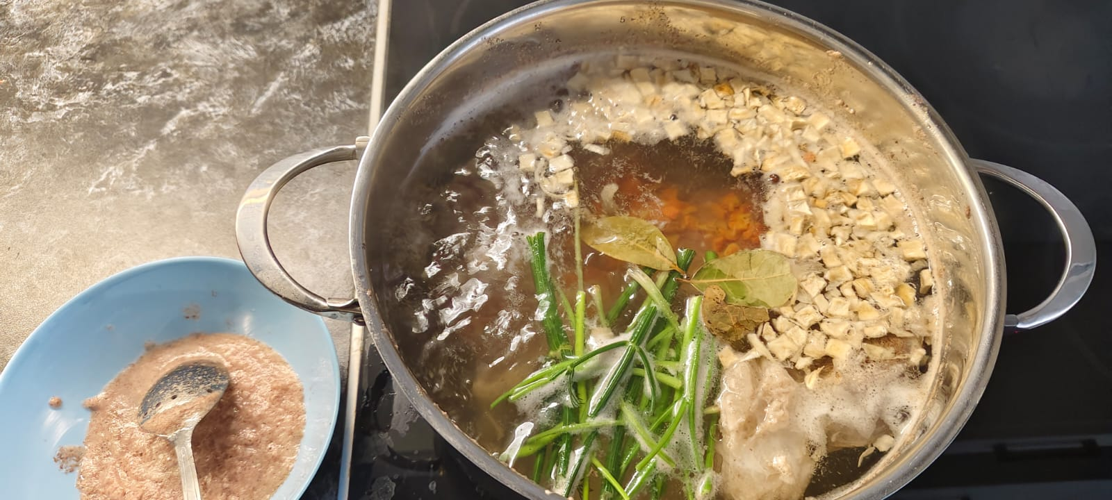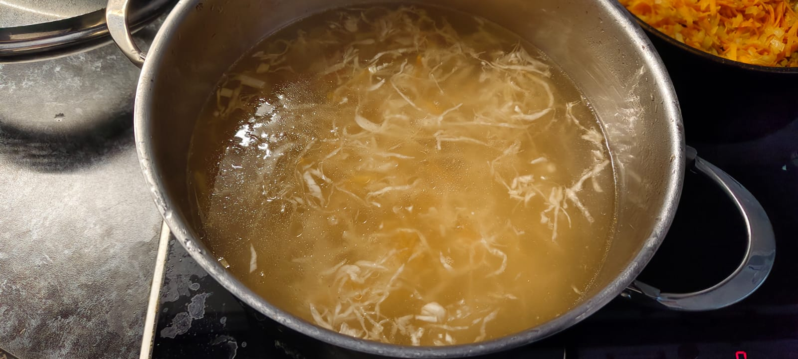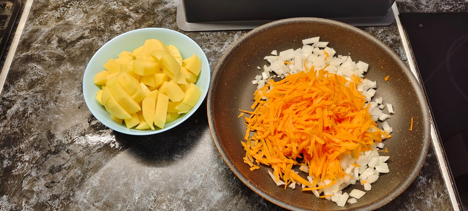 Пока бульон варится занимаюсь овощами. Картофель очищаю и нарезаю, лук нарезаю морковь натираю на терке. Отправлю обжариваться лук и морковь