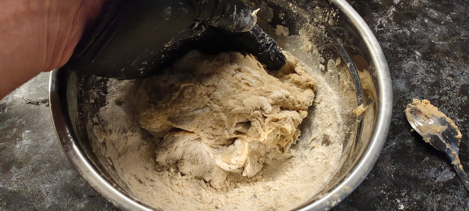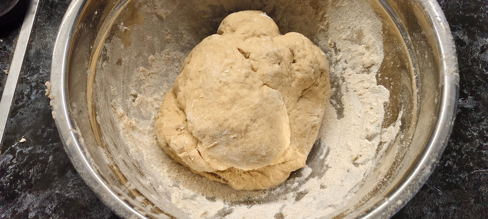 Вымесил на столе и обратно в миску убрал. Накрыл миску крышкой и убрал на час в тёплое место. Тесто должно дойти и увеличится.