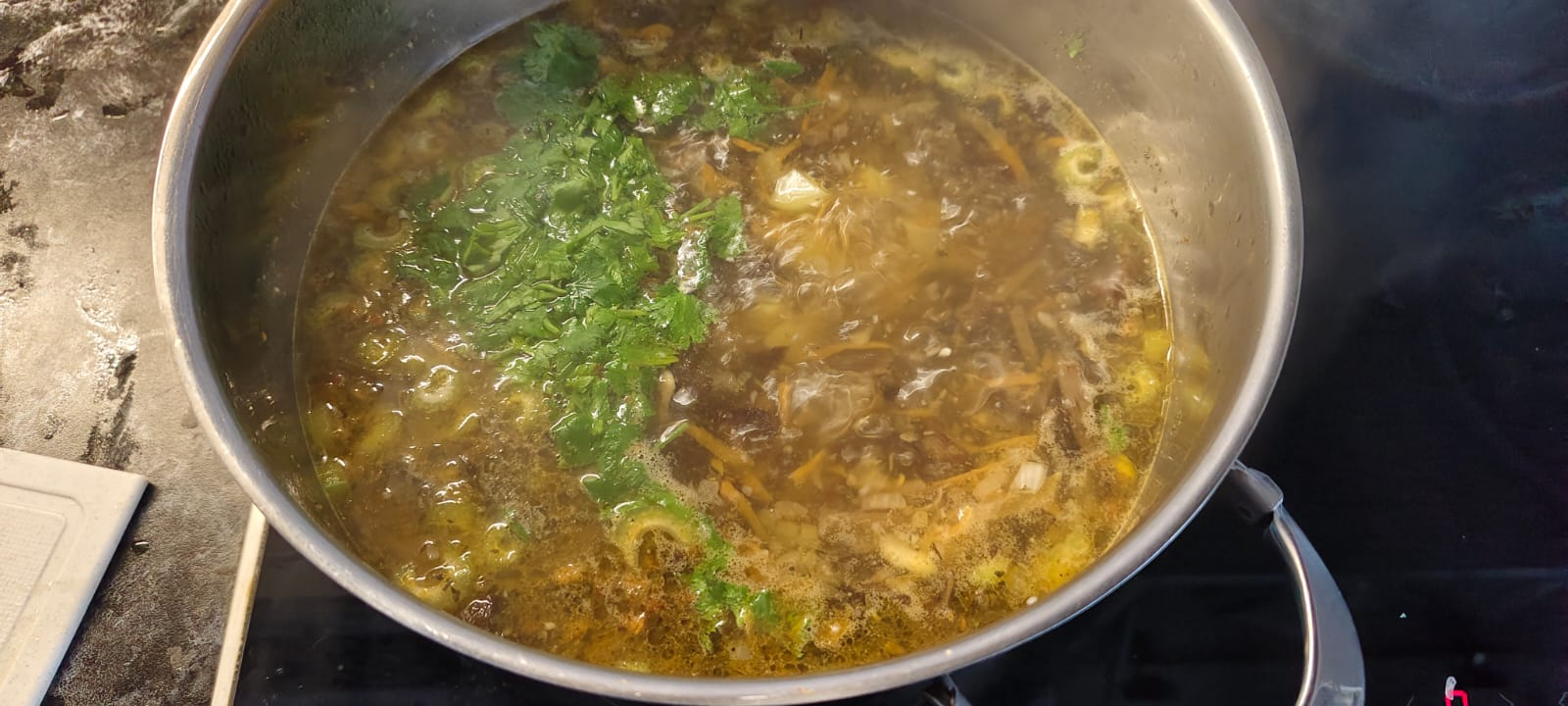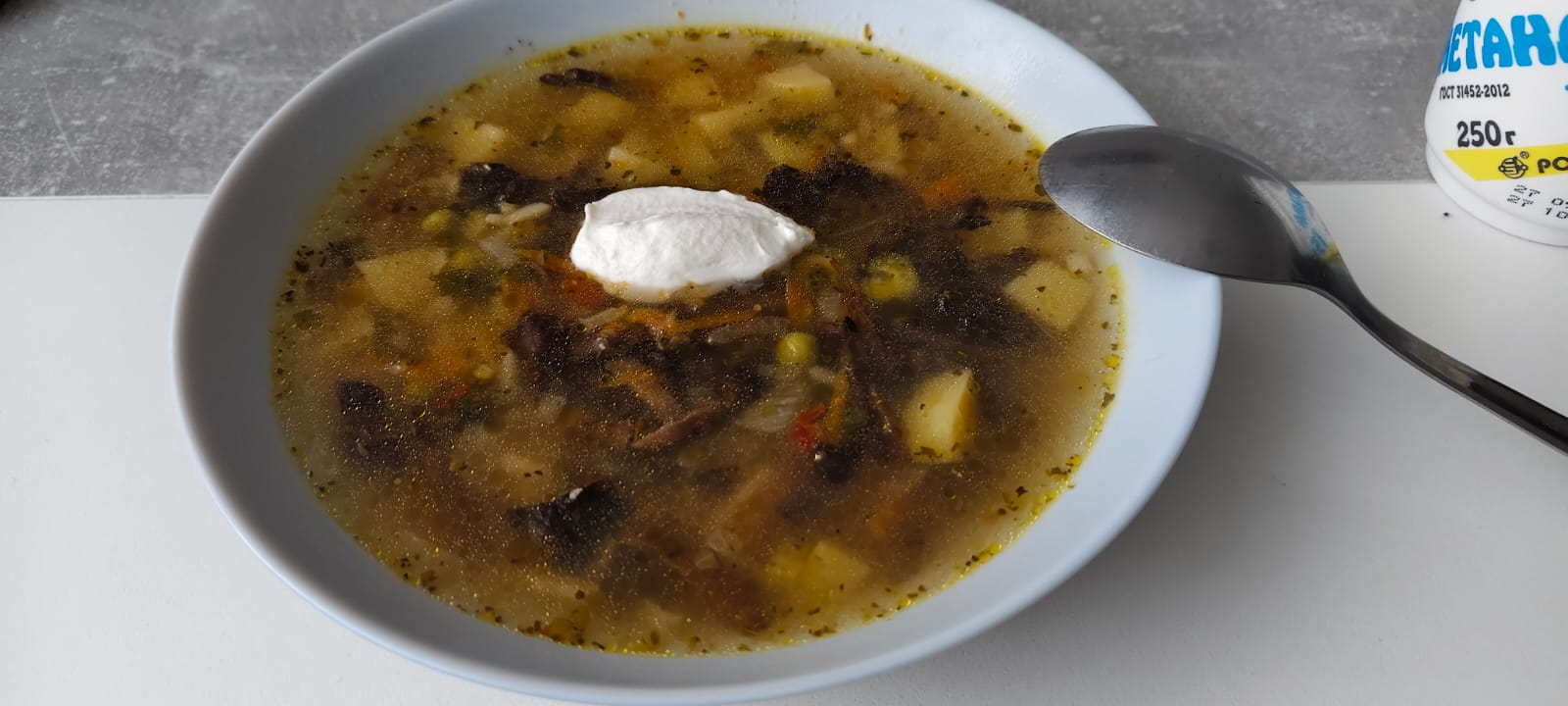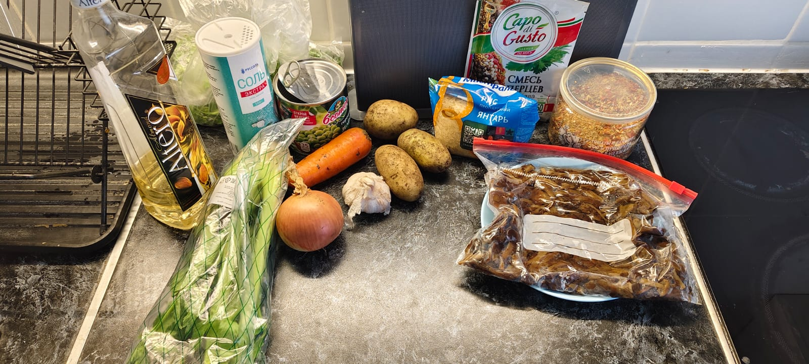 Опята ( отваренные), лук, морковь, картофель, сельдерей, чеснок, рис, горошек, специи, зелень, масло. соль.