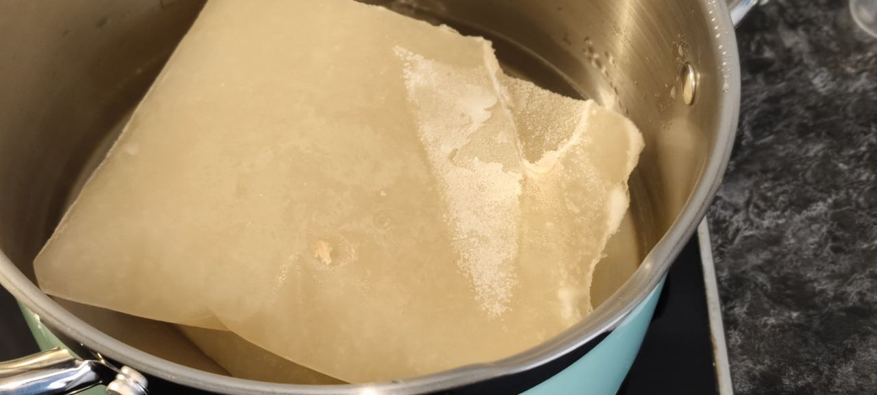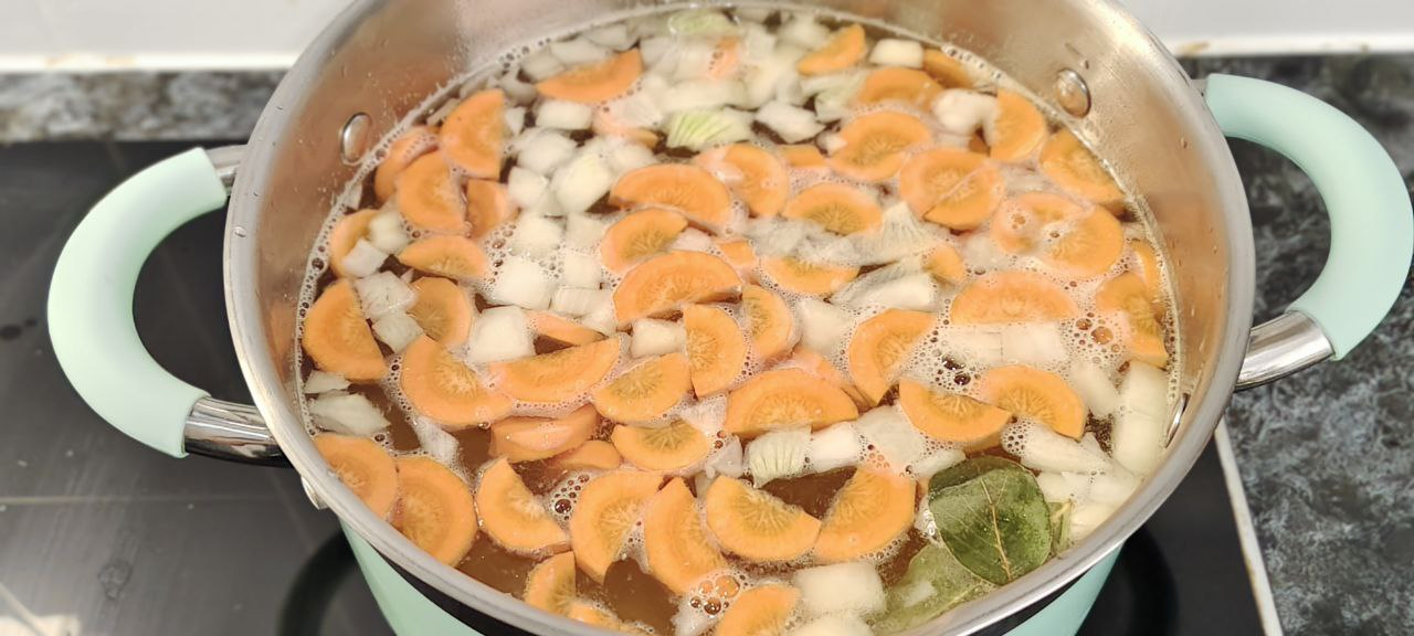 Бульон выкладываю в кастрюлю. Он концентрированный. Поэтому добавляю воды.