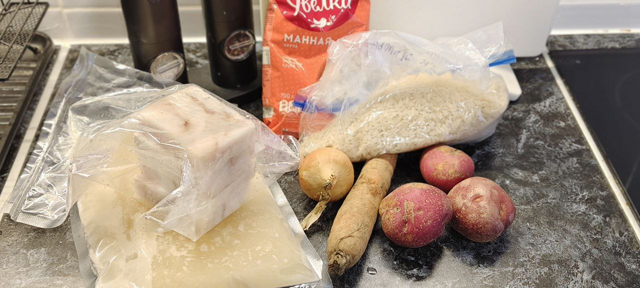 Рыбный бульон, рыбное филе ( треска), лук, морковь, картофель, рис, манка, соль, перец.