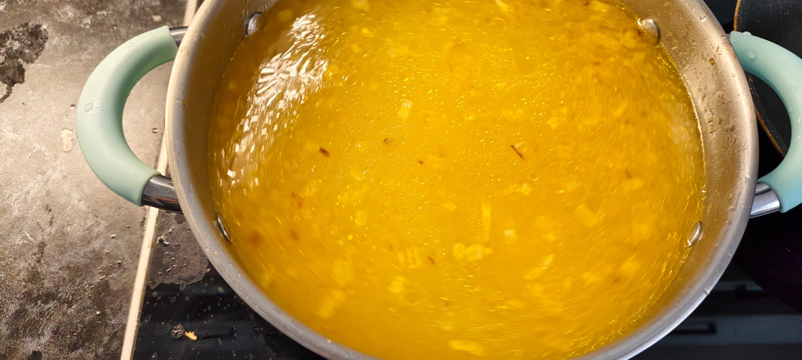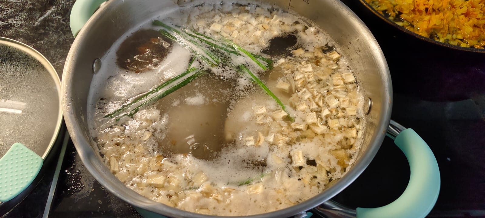 Начинаю собирать суп. Добавляю поджарку, рис, картофель, сыр и курицу разобранную на мелкие кусочки. Варю до готовности картофеля и риса.