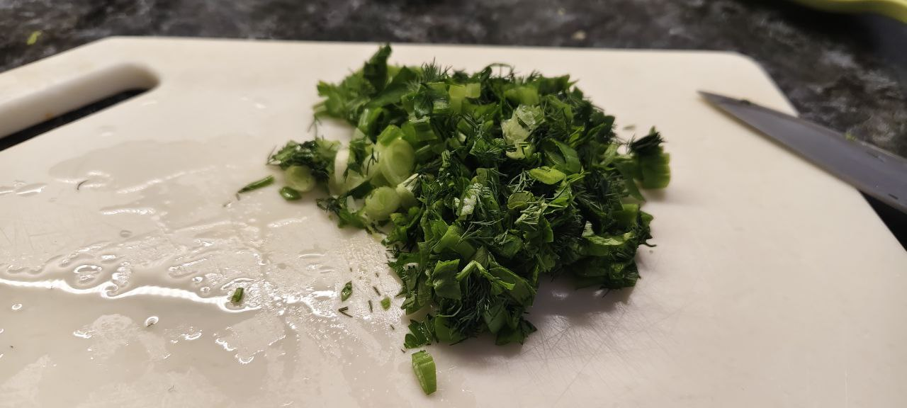Зелень по вкусу. У меня - укроп, зелёный лук и петрушка