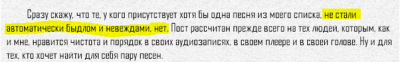 По-моему , пост , сам по себе очень даже хорош. Но я возмущен тем , как ты его преподносишь.Какого черта я быдло с того , что какой-то "Хер" написал в своем посту , что это очень паршиво , когда думают , что слушают , к примеру , Боба Марли ,а оказывается это вовсе не он. Не кажется ли тебе , что следует ушат гавна опрокинуть не на неосведомленных слушателей , а на тех "Умников" , что "Заливают" переименованные композиции на различные сайты?