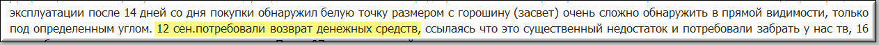 Я не пишу про 14 дней, я пишу после 14 дней со дня покупки обнаружен недостаток. Я требую деньги, мотивируя что это существенный недостаток. Замена матрицы по стоимости приблежена к стоимости всего телевизора. Но не мне судить, только судья решает существенность недостатка
