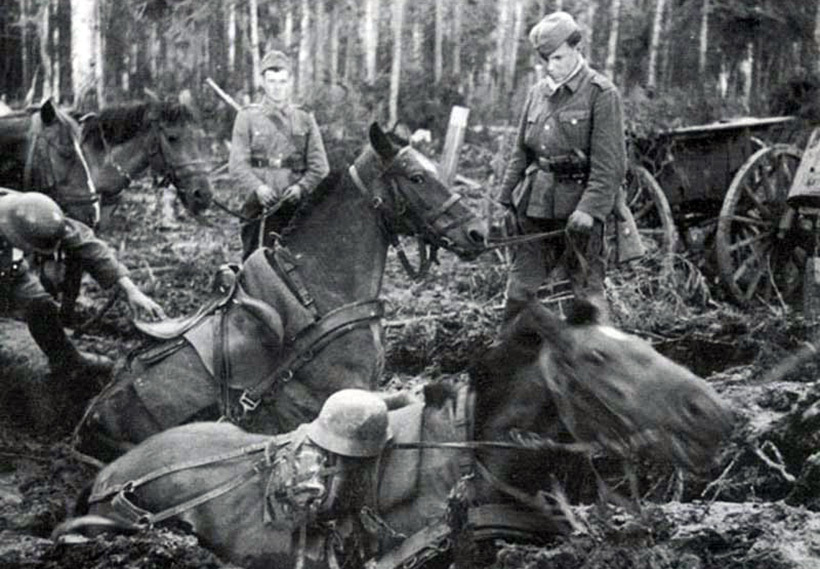 Германские войска в Новгородской области. Лошади погрязли по пузо