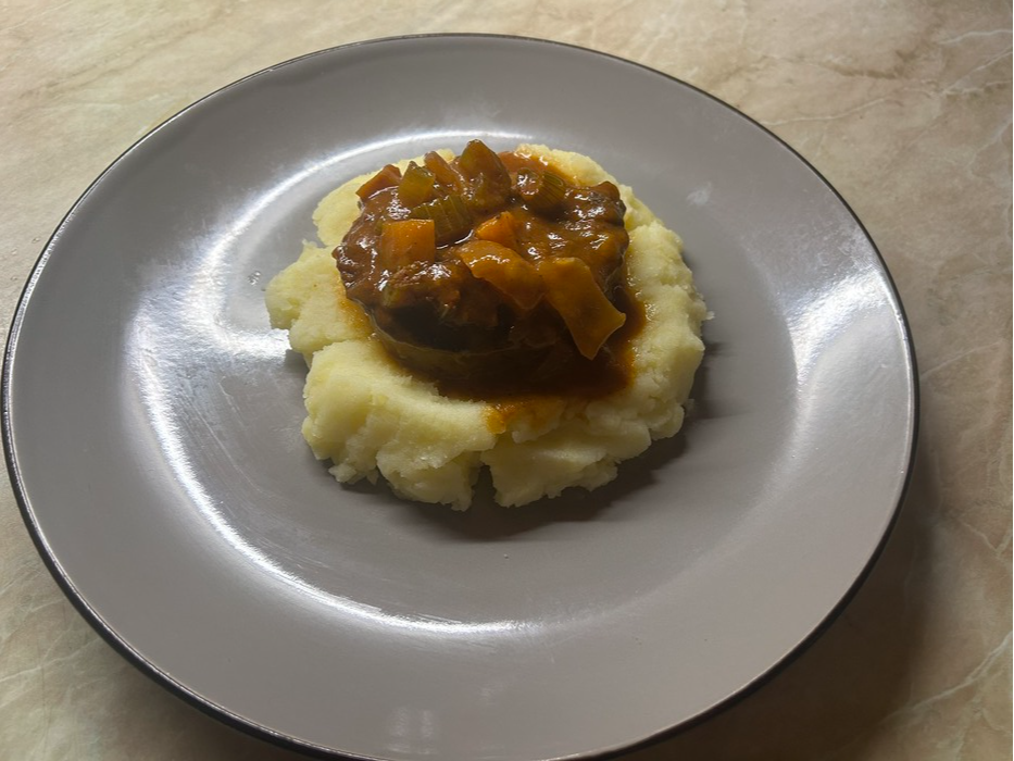 И так оссобуко, дословно переводится как "кость с дыркой", по факту это срез голяшки стейковой, или чуть толще, толщины, в центре которого мозговая косточка, чей мозг, при растапливании дает свою "фишечку" в рецепте, на гарнир к нему в самой Италии, обычно идут: ризотто, полента или паста, но не будем так с этим заморачиваться и просто сделаем базовую картофельную пюрешку.
