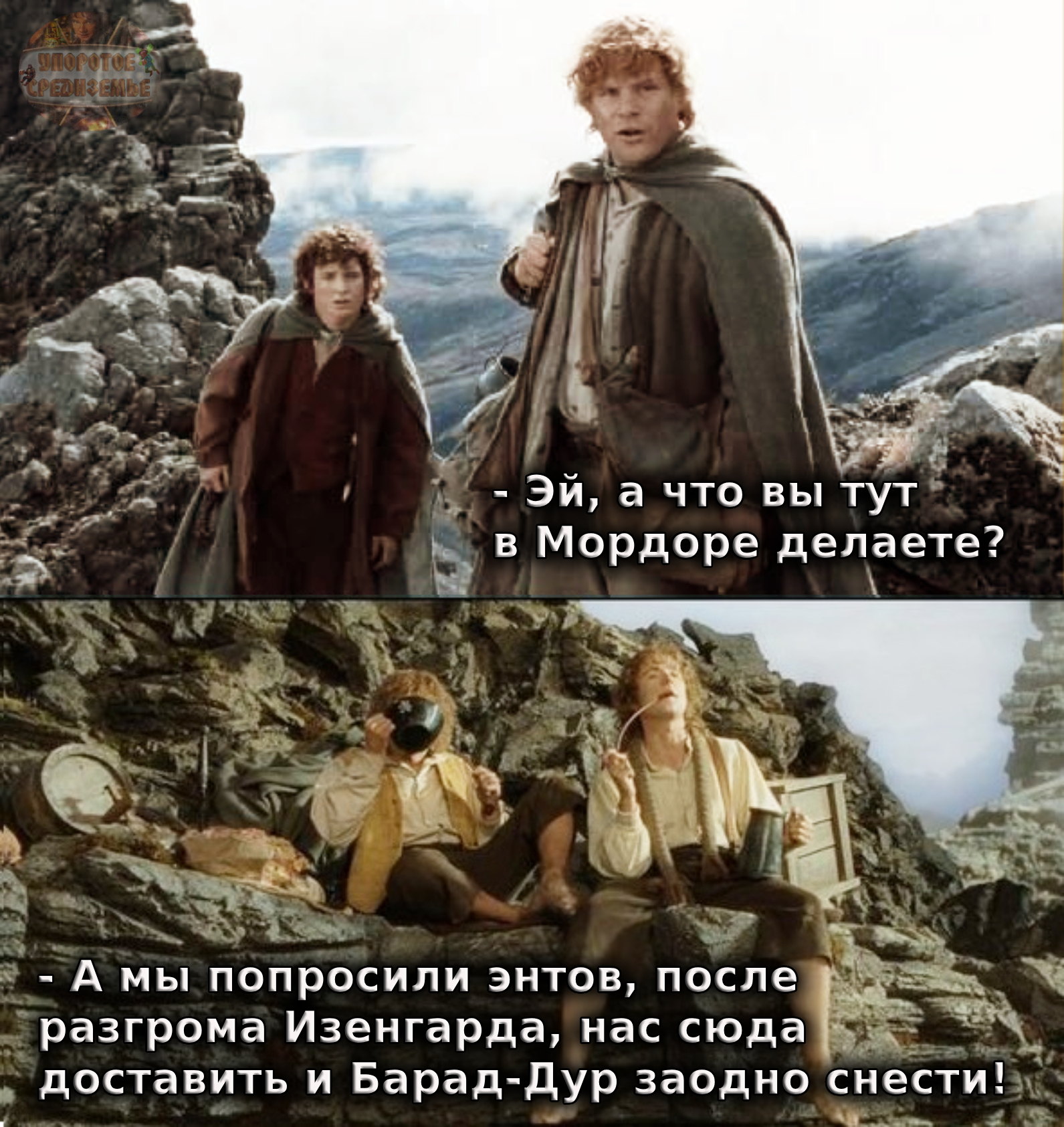311 T0mB0mbadil 6 месяцев назад Средиземье - мир Толкина Мэри и Пиппин в Мордоре Из группы: Упоротое Средиземье [моё] Упоротое Средиземье Властелин колец Фродо Бэггинс Сэм Гэмджи Мериадок Брендибак Перегрин Тук Мордор Юмор Мемы Картинка с текстом Энты Барад-дур 18 1 Ещё 0