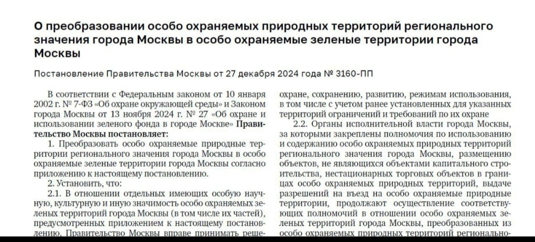 27 декабря 2024 года был принят документ, который серьёзно изменяет статус охраны природных территорий Москвы.