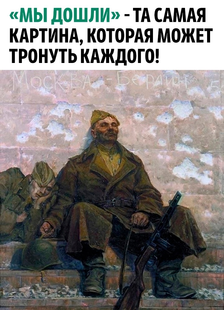 6715 Milana.M История "Мы дошли" - этим всё сказано 2 года назад Источник https://vk.com/wall-73476_2348339 Картина Великая Отечественная война Солдаты Победа Картинка с текстом ВКонтакте (ссылка) 276 69 58 12 9 Ещё 0