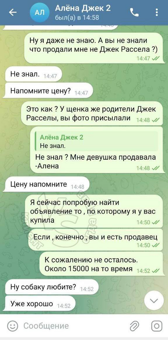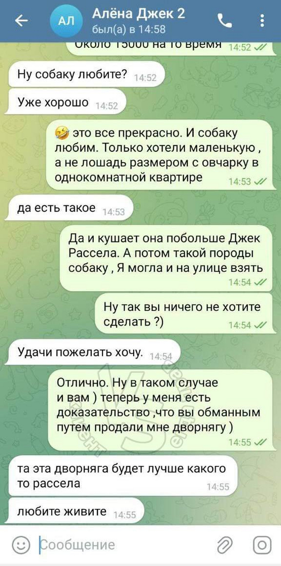 3805 KlientVsegdaPrav "Мы хотели маленькую, а не лошадь размером с овчарку" 1 год назад Девушка купила у заводчика собак Джек Рассела за 15 000 рублей, но из него вырос большой двортерьер. Обманутая покупательница написала продавцу претензию и вместо разъяснений получила совет — просто любить и жить. Переписка Скриншот Обман Собака Картинка с текстом Telegram Длиннопост Telegram (ссылка) 117 44 20 16 8 Ещё 0