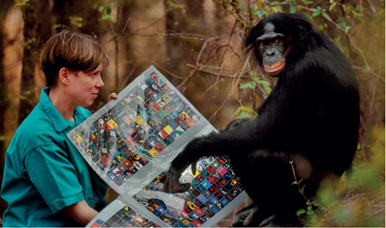 Приматолог Сью Сэвидж-Рамбо и бонобо используют клавиатуру для общения друг с другом. Сэвидж-Рамбо установила, что эти обезьяны, как и дети, учатся наблюдая, и что без специальной подготовки они тоже могут научиться пользоваться символами, наблюдая, как другие используют эти символы в повседневной коммуникации. Источник: «Deep Thinkers: Inside the Minds of Whales, Dolphins, and Porpoises»