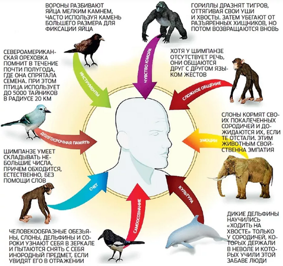 Итак, получается, что принципиальных — качественных отличий в спектре способностей людей и животных нет: ни в части интеллектуальных способностей, ни в части сознания.