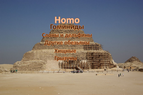 Венец эволюции — Homo в одиночестве занимает высшую ступень. Между гоминидами и другими обезьянами, правда, вклиниваются слоны и дельфины, что несколько нарушает стройность этой картины. Но эволюция — большая затейница. Да и дельфины со слонами — животные, человеку приятные. И потому воспринимаются людьми достойными соседями «венца природы» на «эволюционной интеллектуальной лестнице».