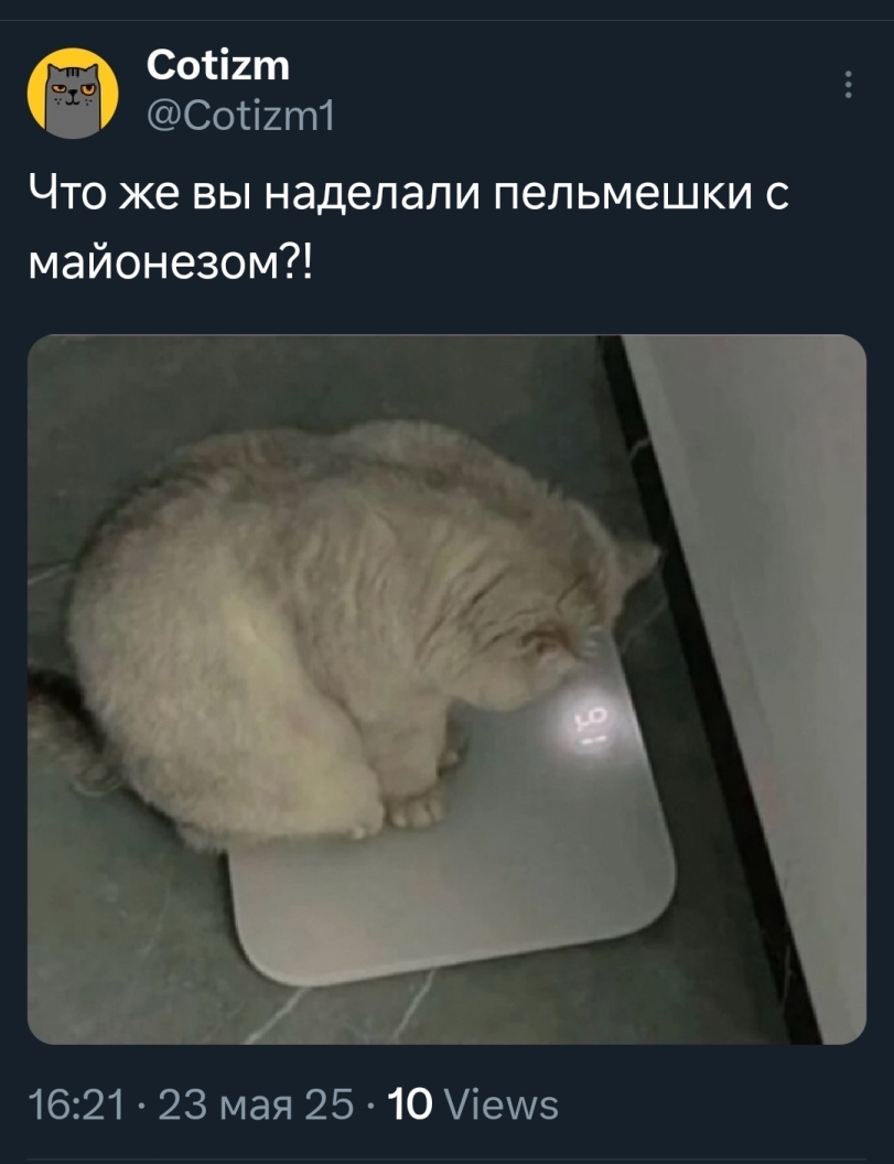 75 Perevalka Всё обо всём Серия Приколы для взрослых котов *Мы сделали тебя пирожочком 5 месяцев назад X (Twitter) Скриншот Кот Вес Весы Толстые котики 4 3 Ещё 0