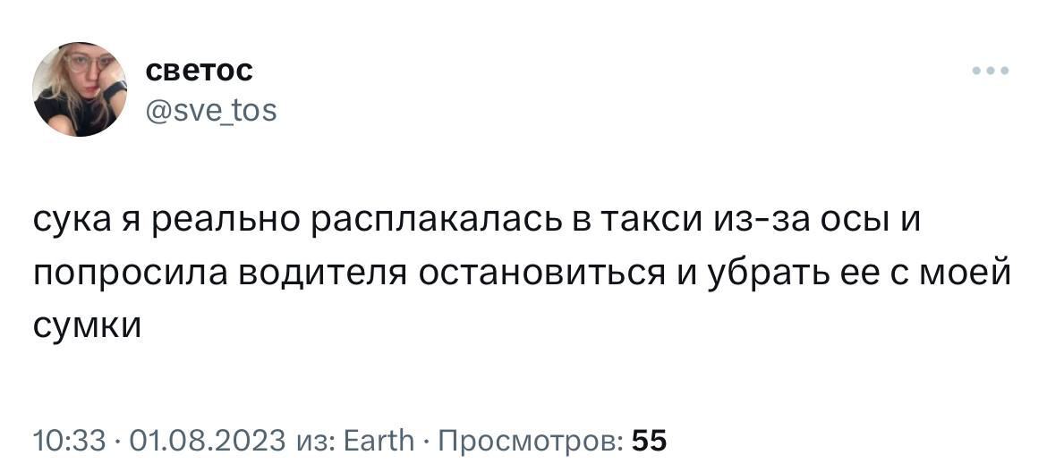 1 wagonmoi 2 года назад Мы все взрослые люди, но осы это осы Такси Скриншот Юмор X (Twitter) Оса Насекомые Ещё 0
