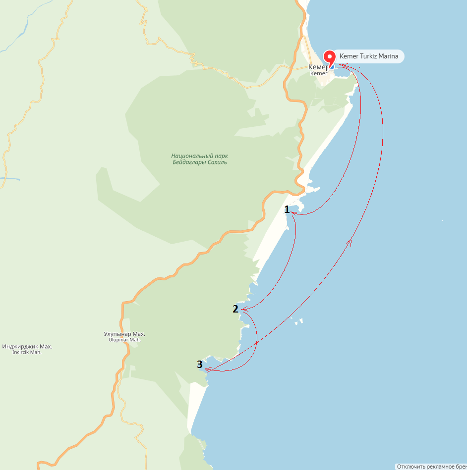 После первой бухты, идет вдоль берега до второй бухты. Во второй тоже самое, что и в первой + подают обед. Дальше уже шла в третью бухту, там было тоже самое, что и в первой. После уже возвращалась в порт. Весь маршрут на яхте идет дискотека, гремит музыка, в свободном доступе алкогольные и безалкогольные напитки (только Турецкого производства). Можно сказать, такая большая алко-прогулка по морю с купанием и обедом.