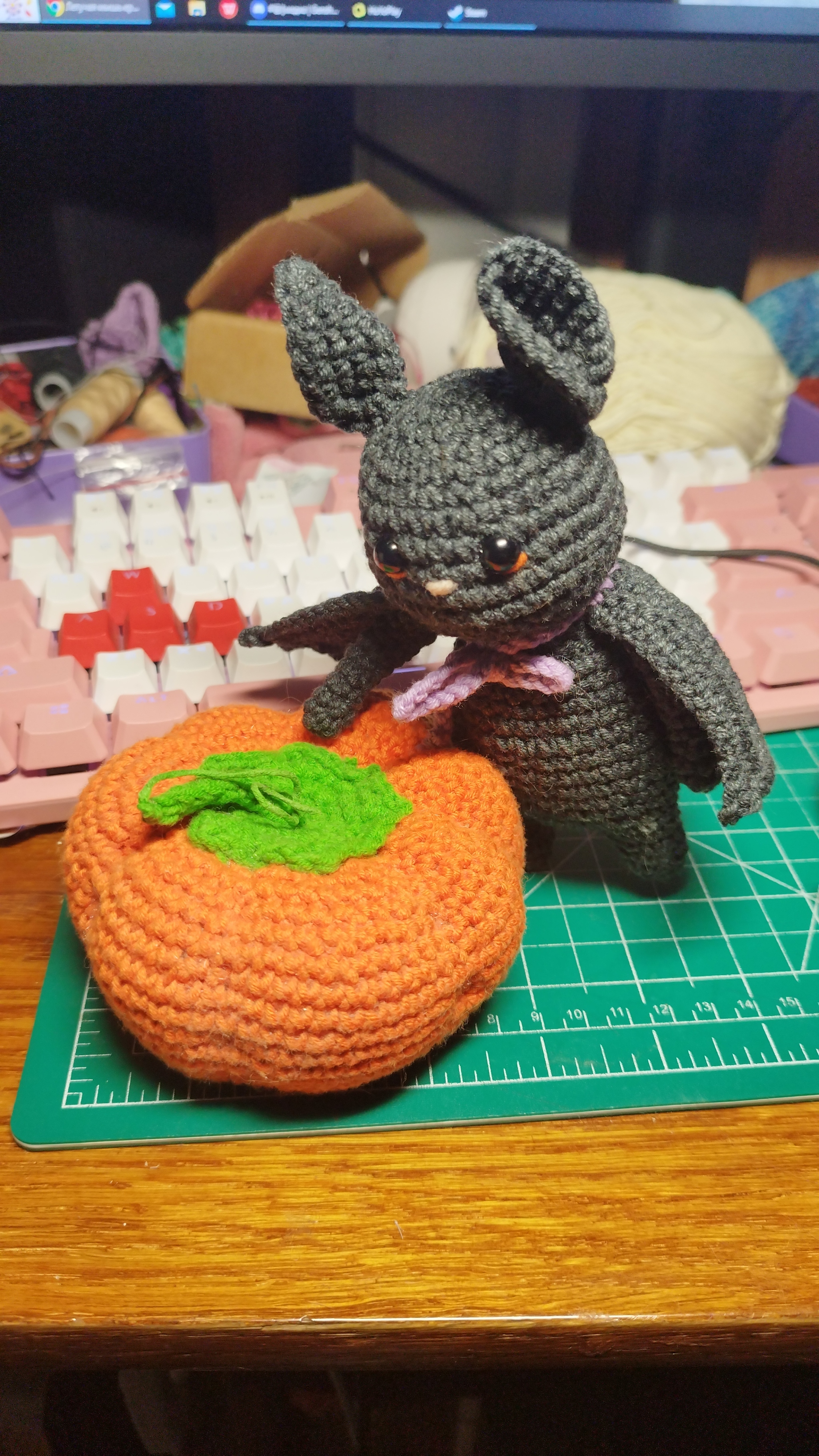 Мышка по мастер-классу от Олеси Байгачевой. Пряжа Yarnart Jeans графит, глазки на безопасном креплении, крылья отдельно в виде плаща. За мышкой тыква