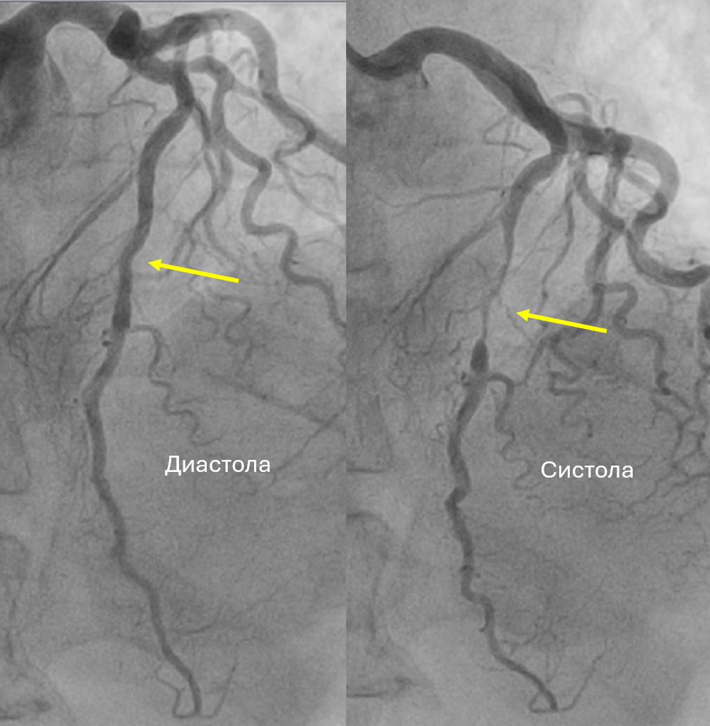 На видео видно динамическое сужение передней межжелудочковой артерии (эффект "доения" - "milk-in")