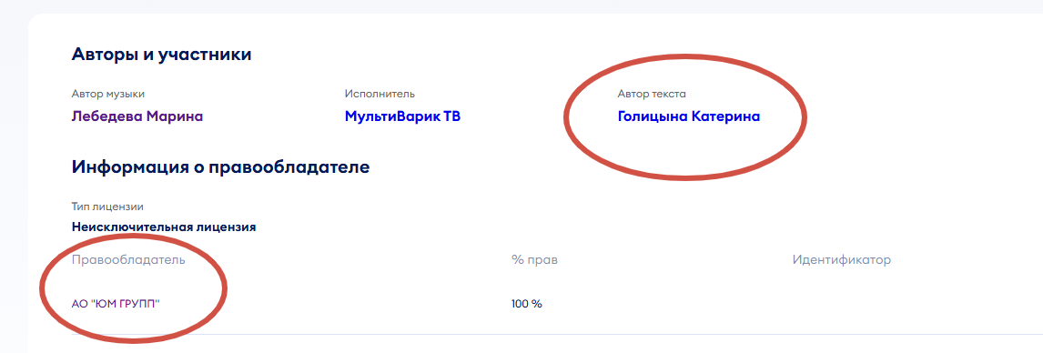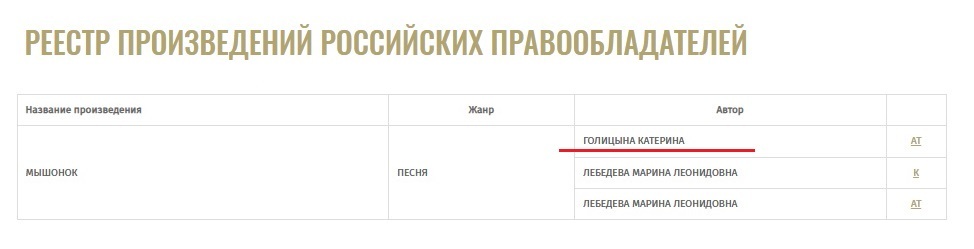 И что мы видим, автором, а точнее соавтором текста (АТ) в реестре РАО указана Голицына Екатерина. Данная информация в РАО заявлена Голицыной. А на музыкальных площадках, таких как Яндекс Музыка, ВК, и других данная песня указана уже единоличное авторство текста Голицыной, а правообладатель АО "ЮМ ГРУПП" 100%. Проверить можно тут.