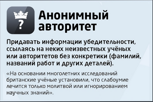 Абсолютно согласен. Меня немного смутила ваша цитата "Например "Апелляция к авторитету" используется ПОСТОЯННО в научных трудах и вообще с ней сталкивается каждый студент (историки в особенности)" Звучит так, будто вы оправдываете этот прием.