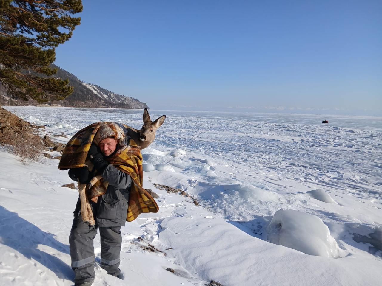 На Байкале косуля поскользнулась на льду и не смогла встать, её пришлось спасать лесникам.